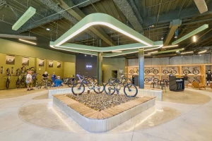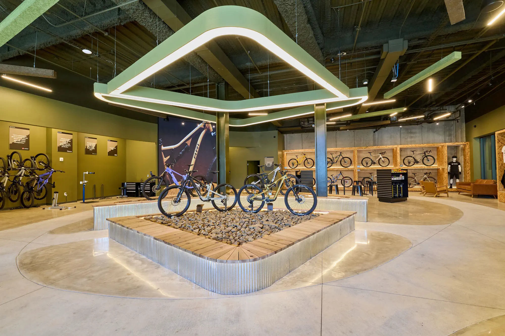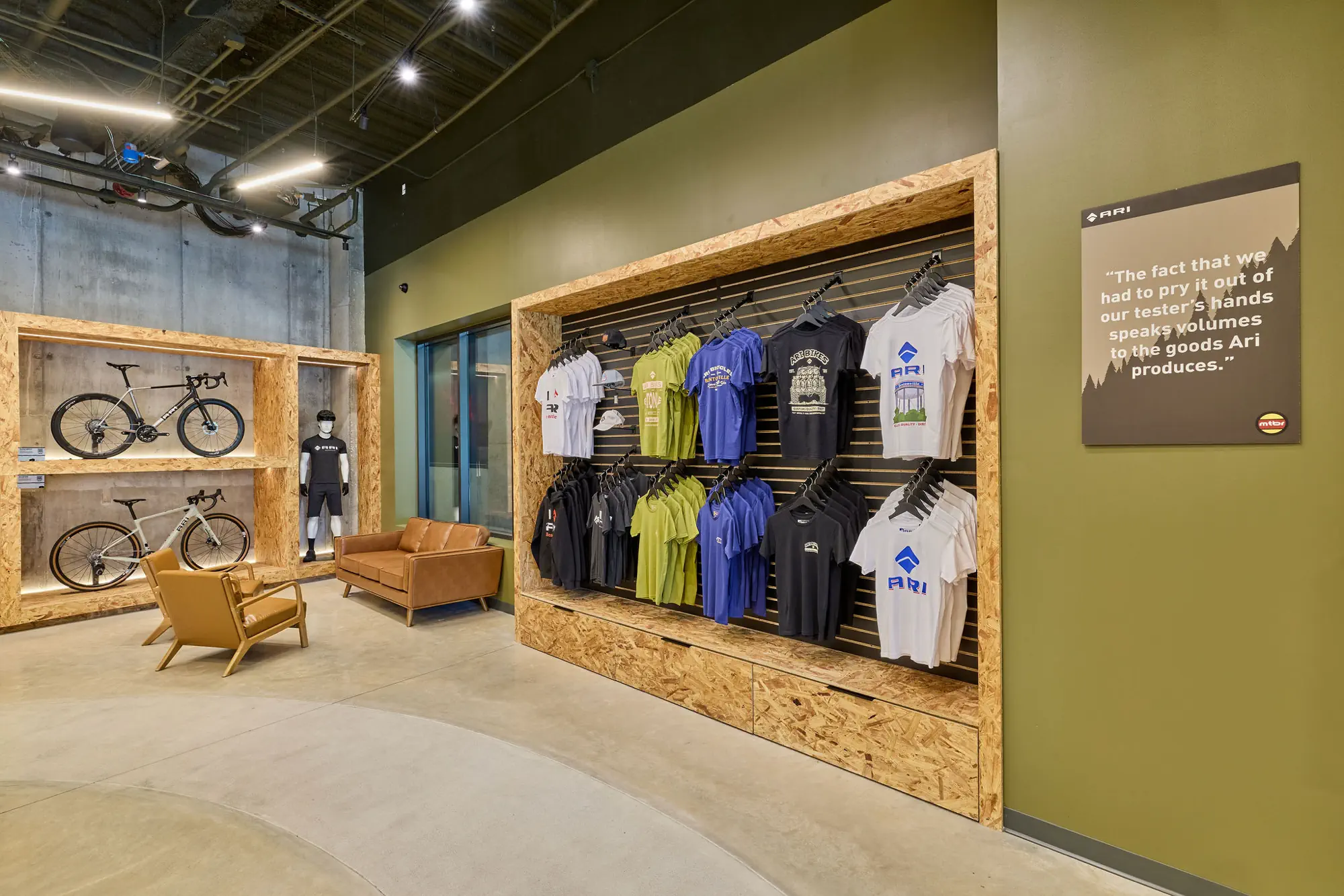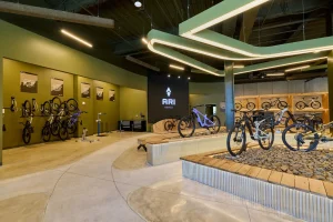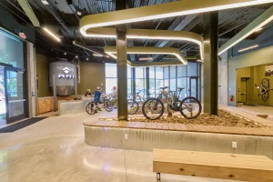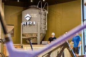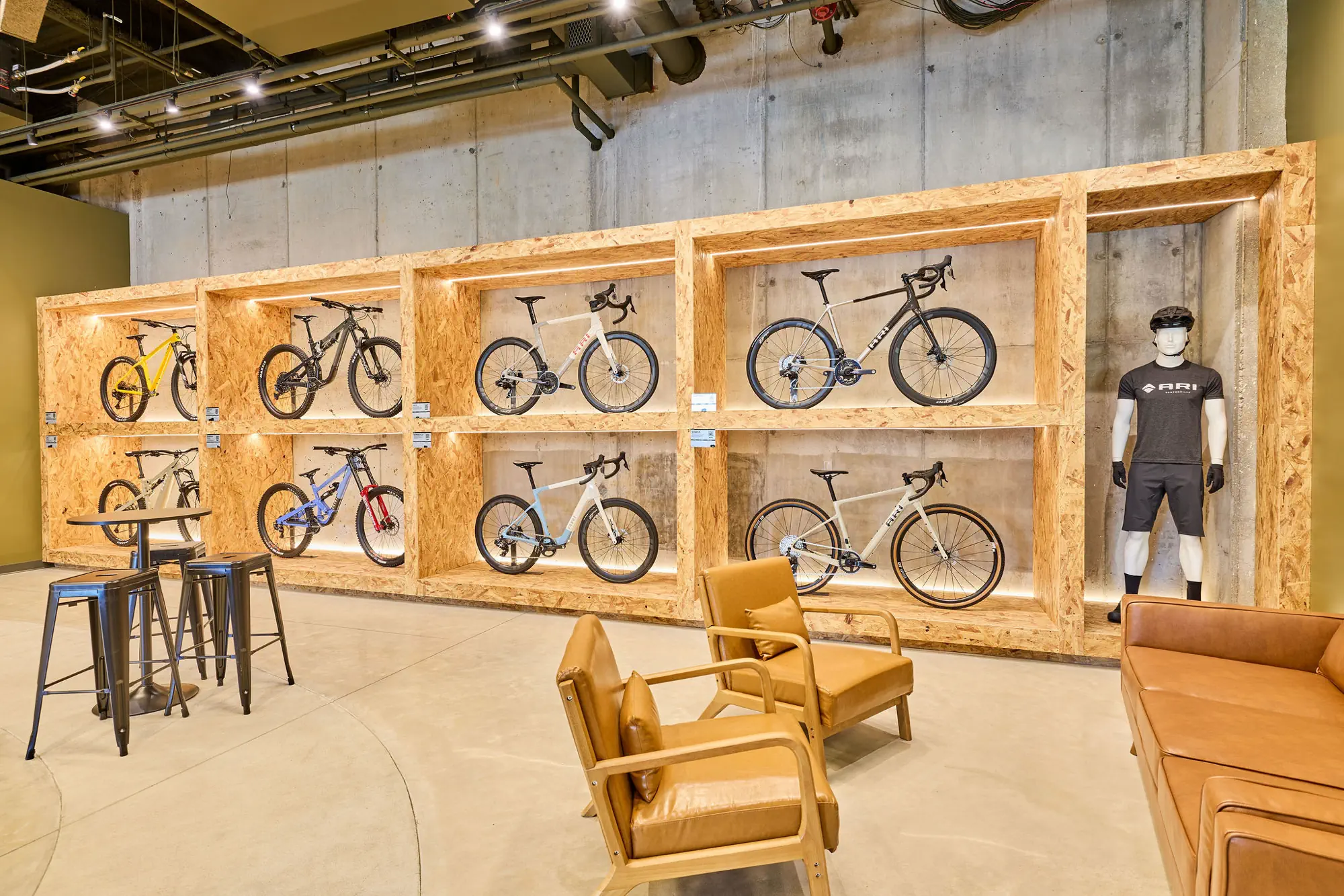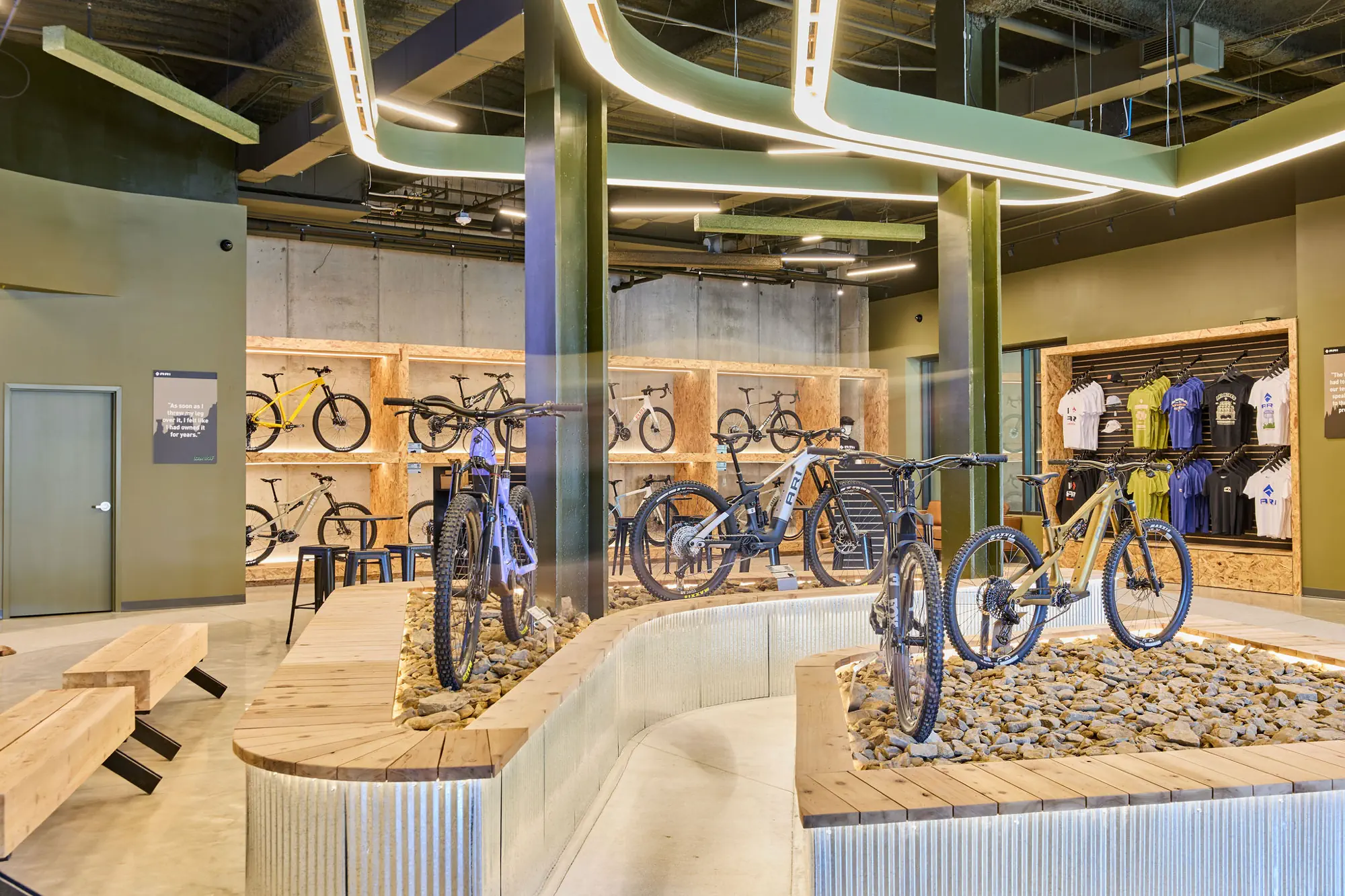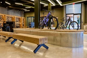 Inspired by the craftsmanship of mountain bike trail builders, commonly available materials are thoughtfully detailed and assembled to elevate the environment with custom touches and authentic character. The showroom balances functionality with a refined aesthetic, creating an inviting experience that celebrates the ARI brand, the natural landscape that influences it, and the community that gathers around it.