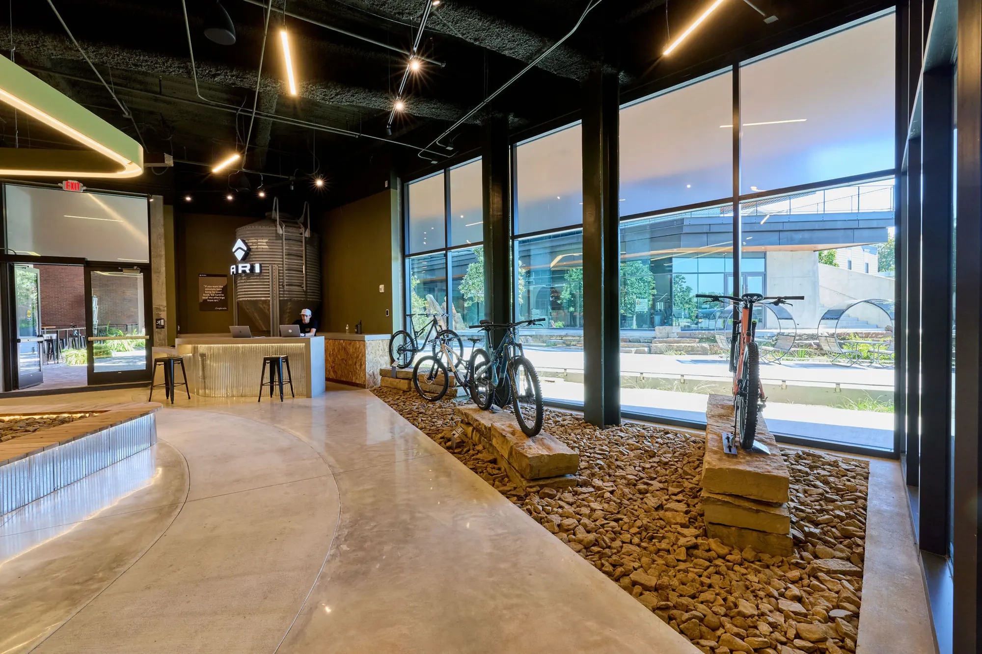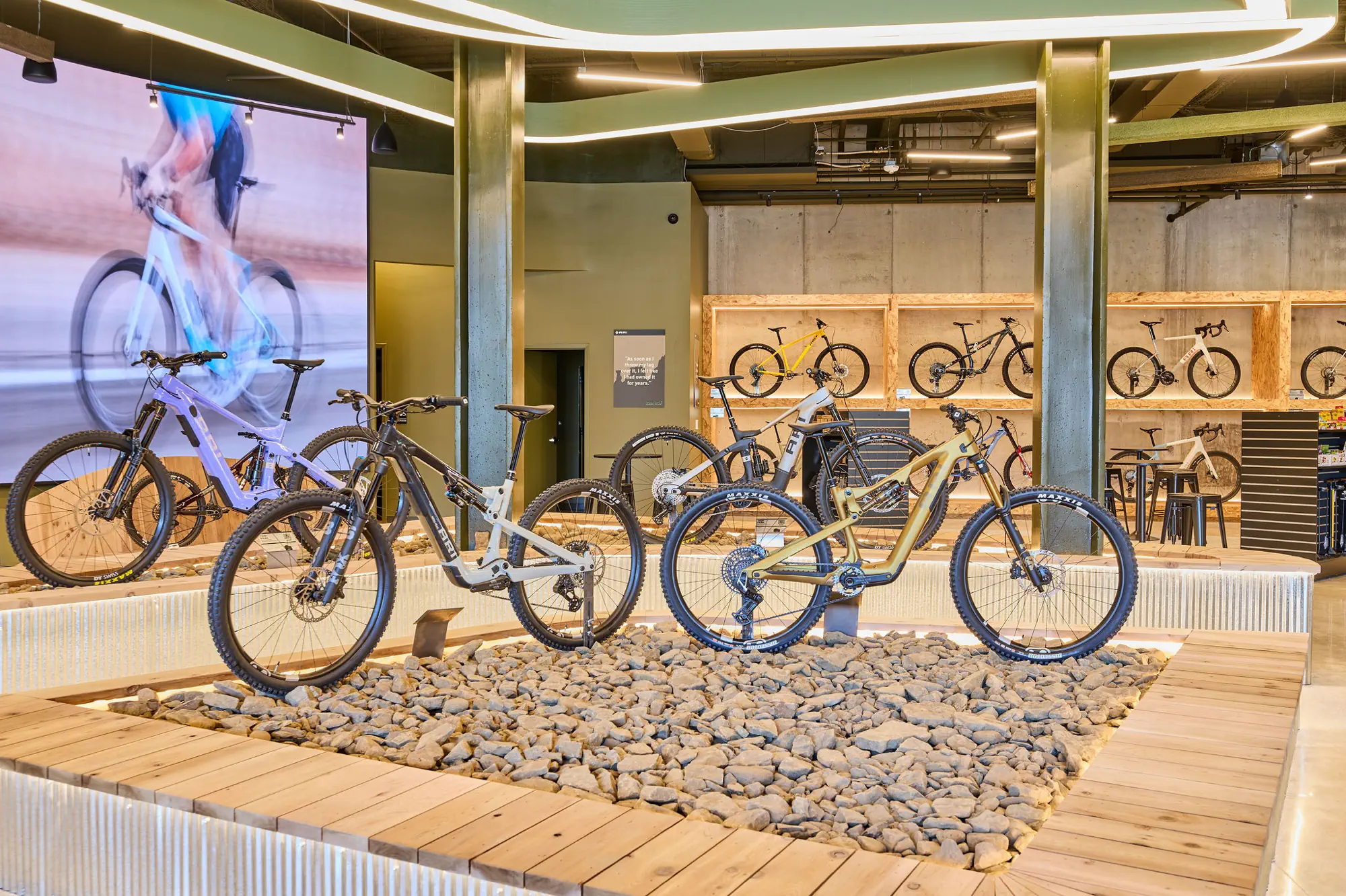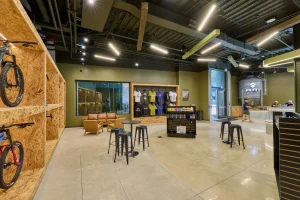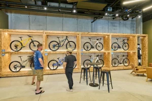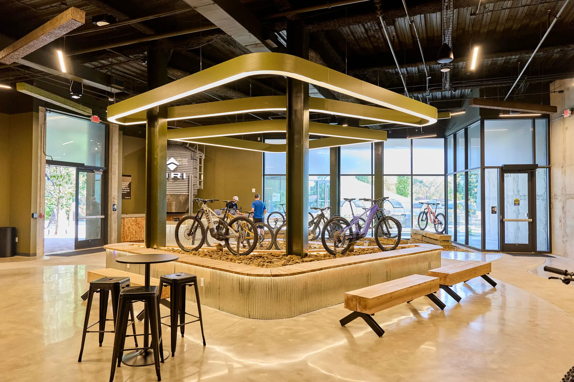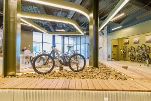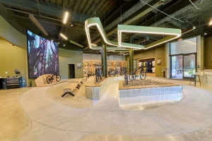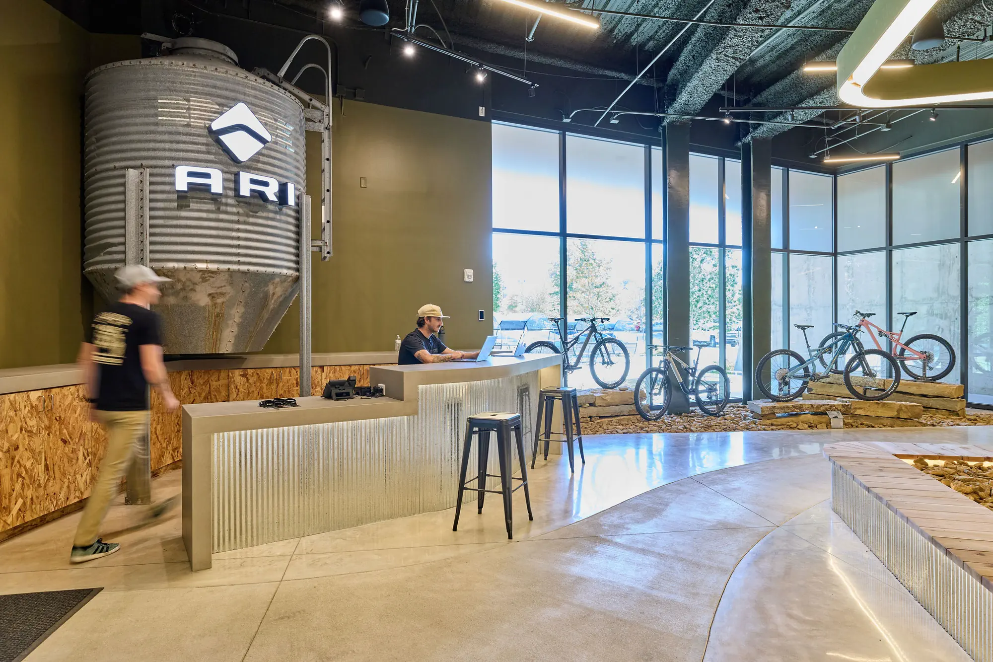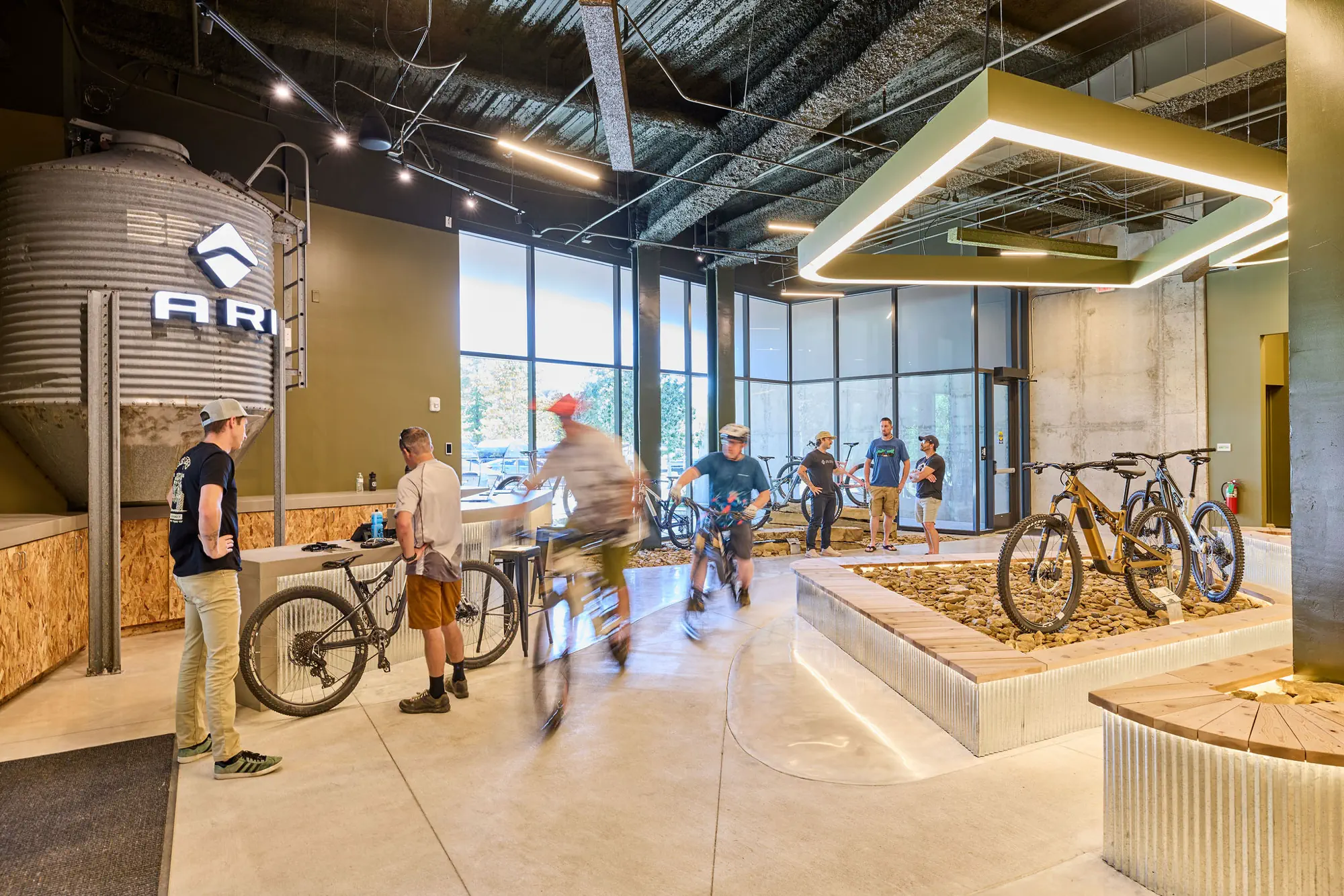 Inspired by the craftsmanship of mountain bike trail builders, commonly available materials are thoughtfully detailed and assembled to elevate the environment with custom touches and authentic character. The showroom balances functionality with a refined aesthetic, creating an inviting experience that celebrates the ARI brand, the natural landscape that influences it, and the community that gathers around it.