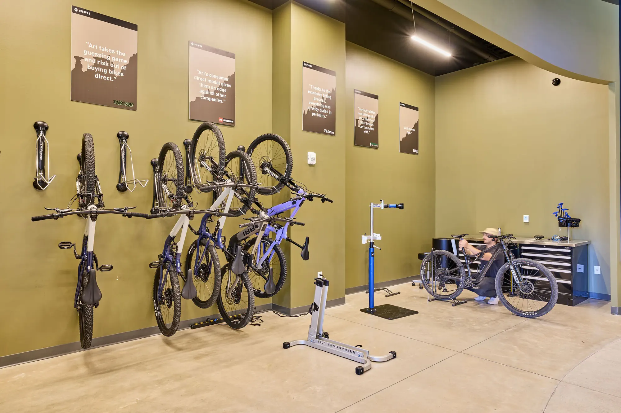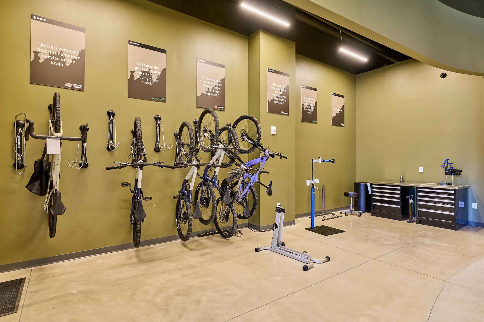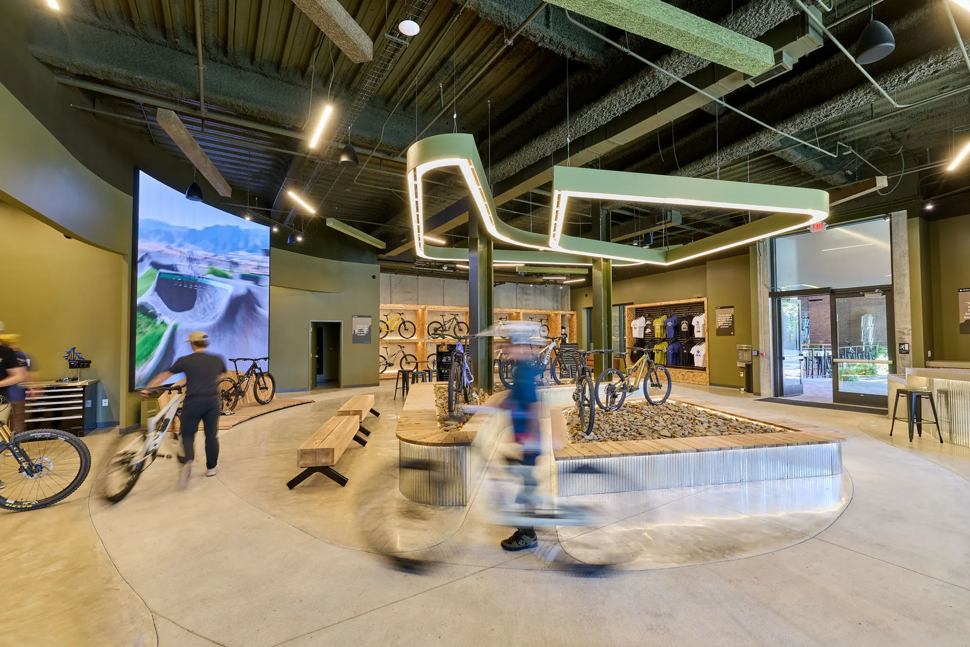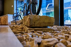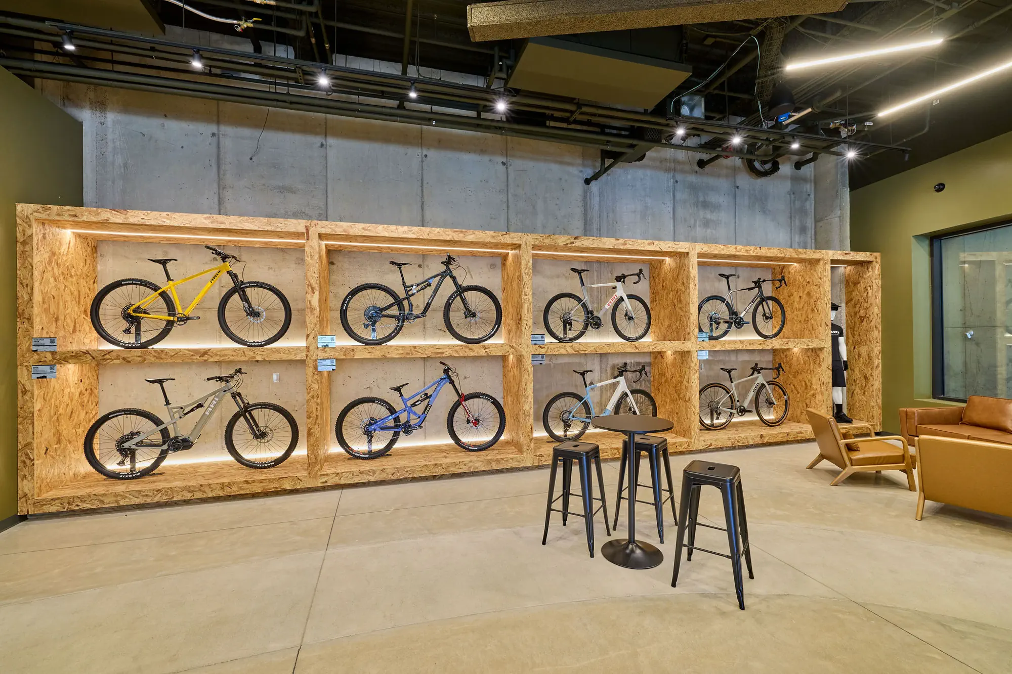Inspired by the craftsmanship of mountain bike trail builders, commonly available materials are thoughtfully detailed and assembled to elevate the environment with custom touches and authentic character. The showroom balances functionality with a refined aesthetic, creating an inviting experience that celebrates the ARI brand, the natural landscape that influences it, and the community that gathers around it.