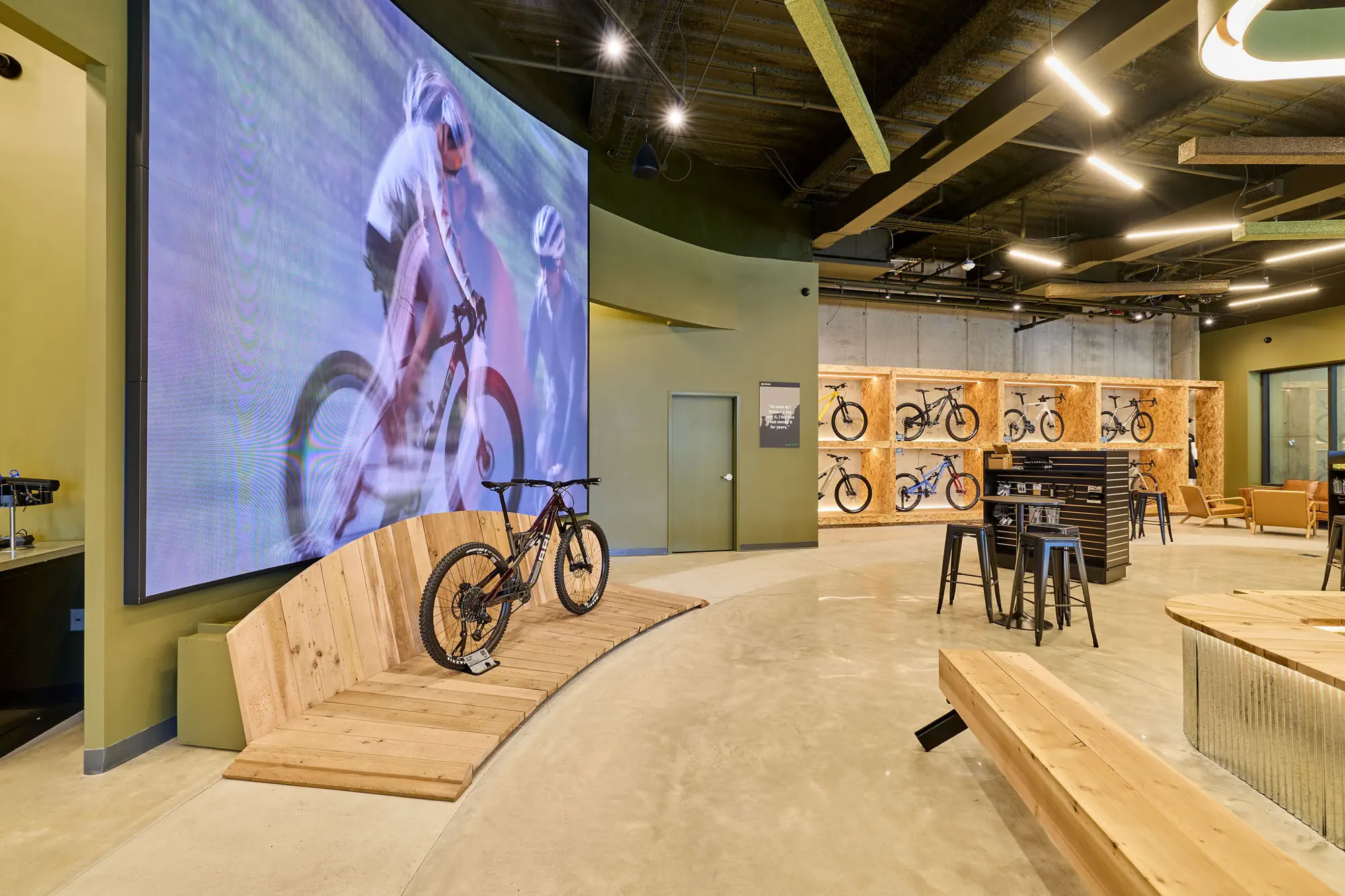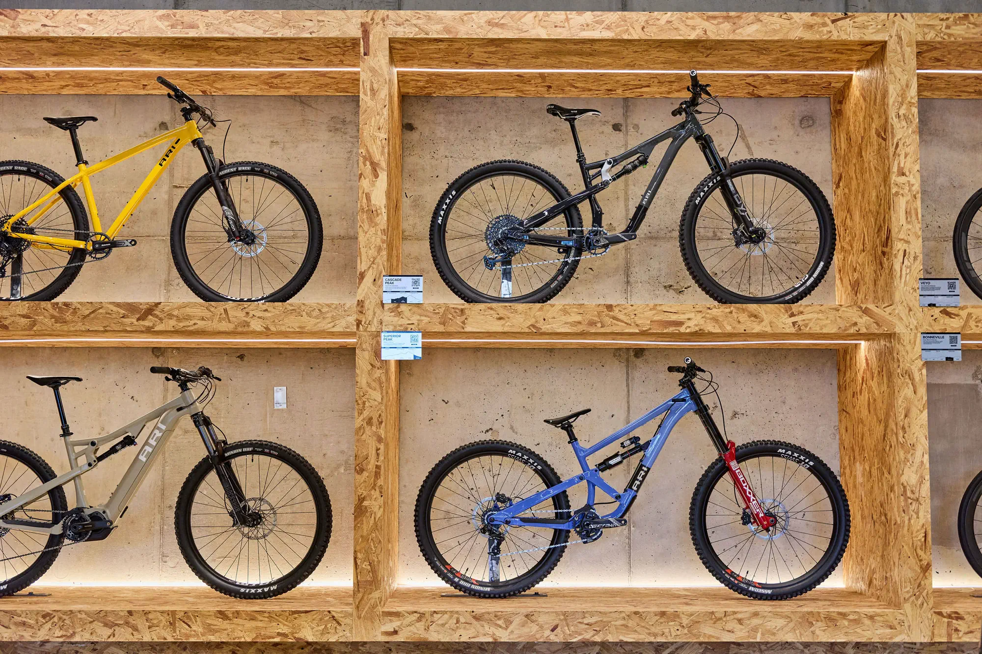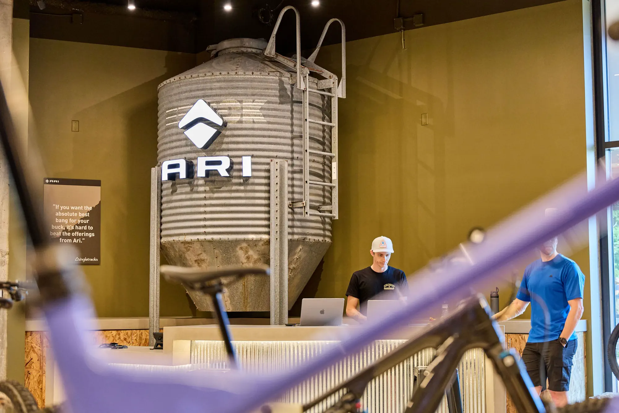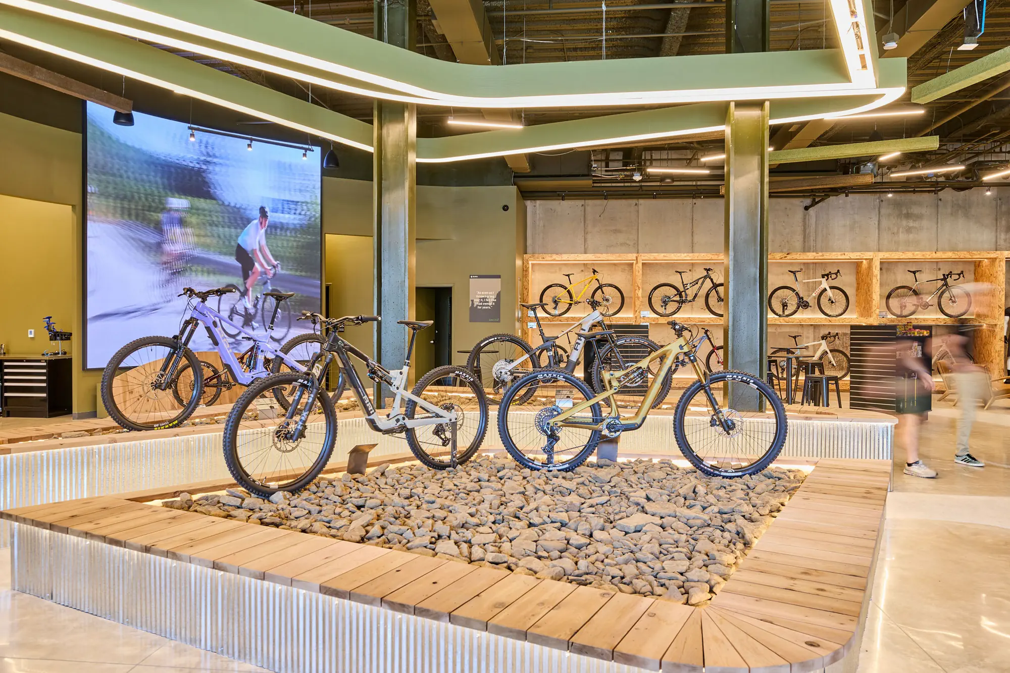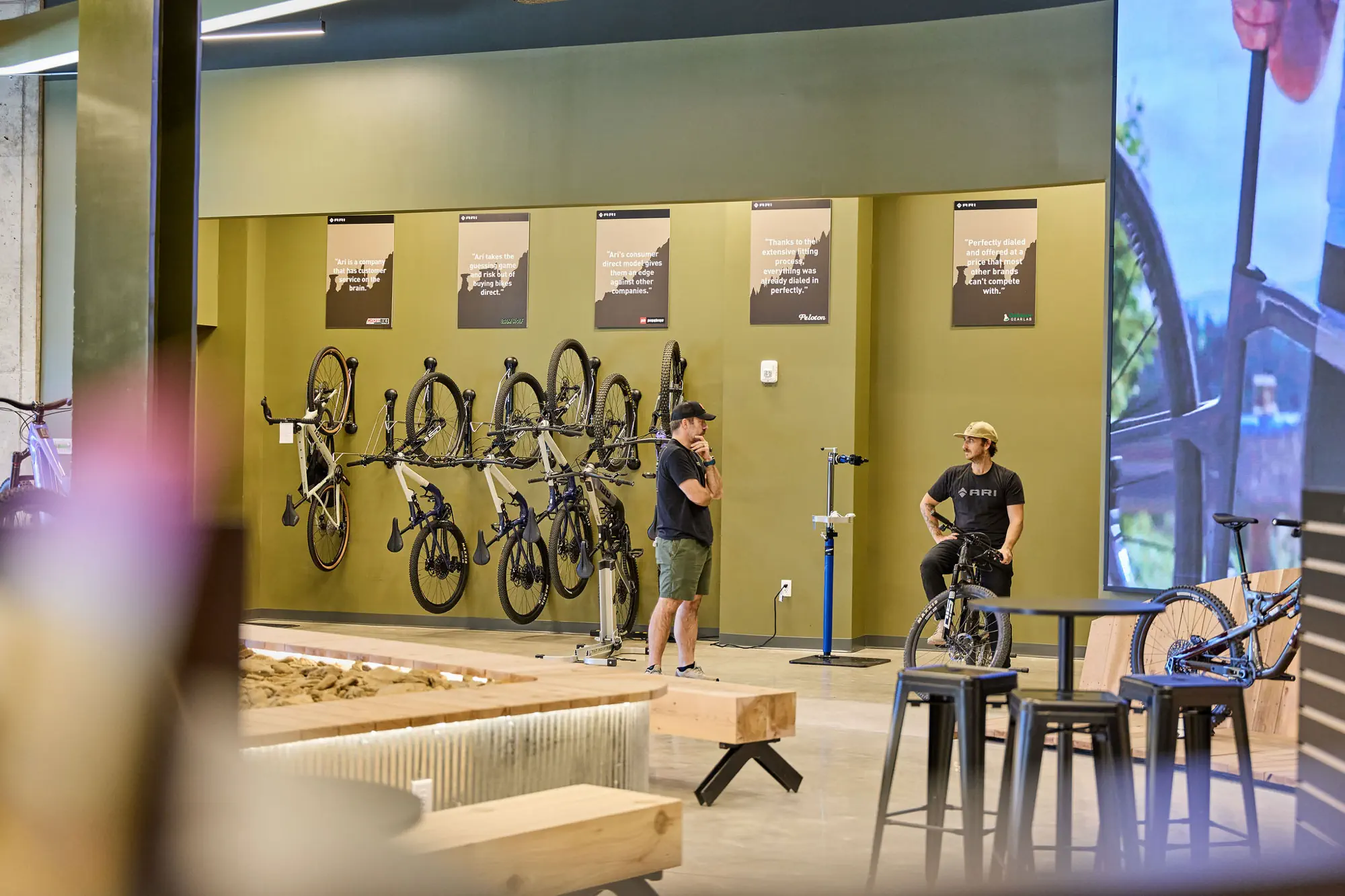 Inspired by the craftsmanship of mountain bike trail builders, commonly available materials are thoughtfully detailed and assembled to elevate the environment with custom touches and authentic character. The showroom balances functionality with a refined aesthetic, creating an inviting experience that celebrates the ARI brand, the natural landscape that influences it, and the community that gathers around it.