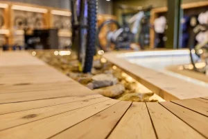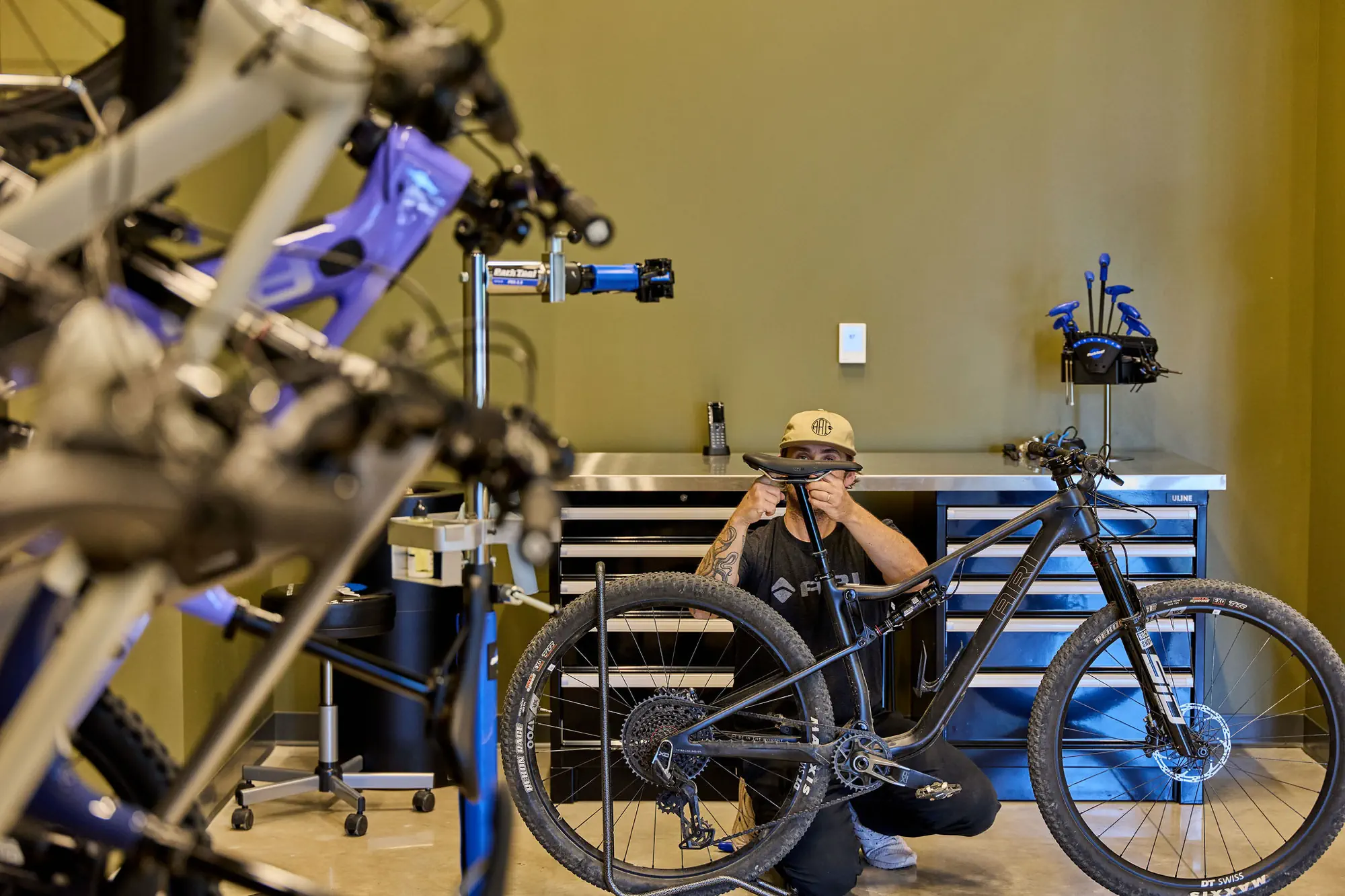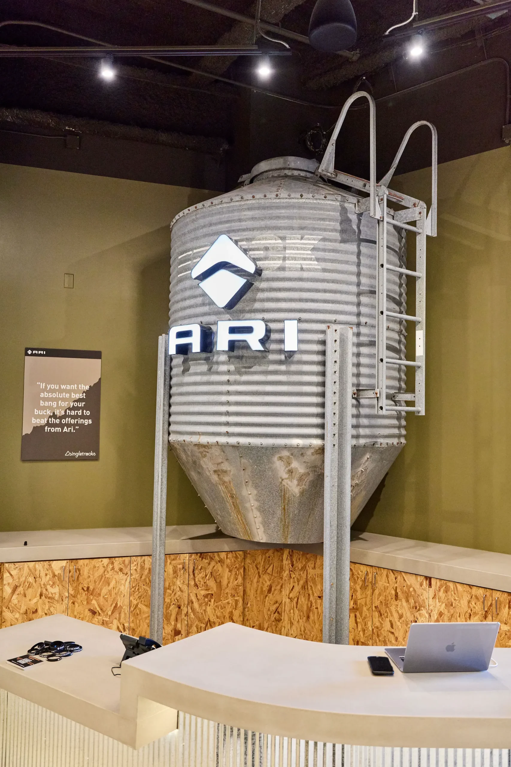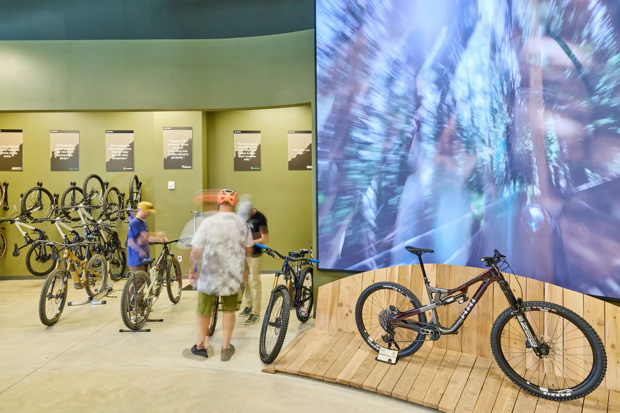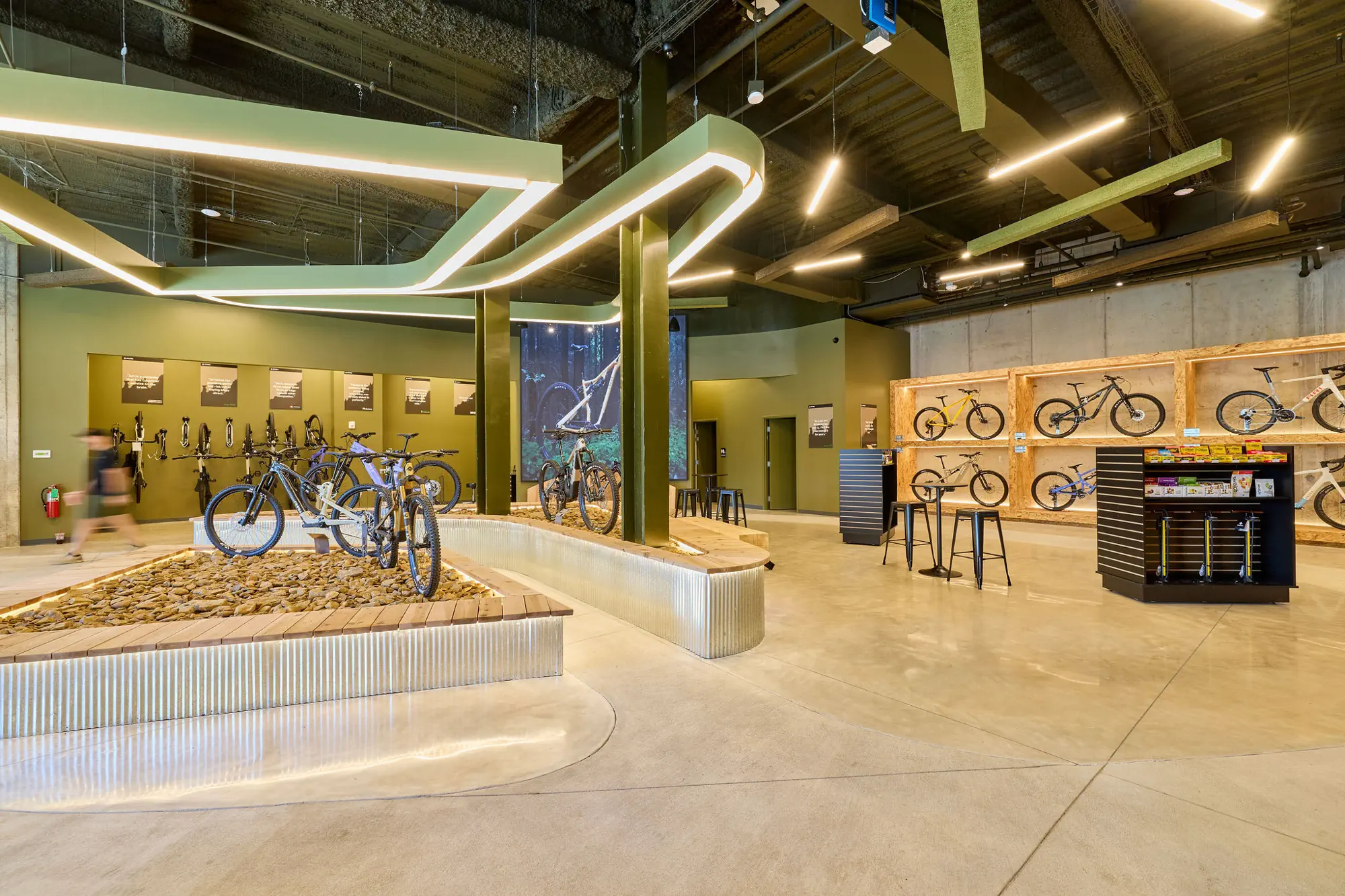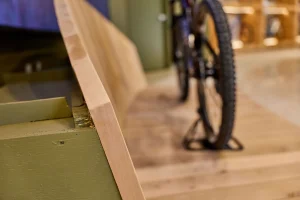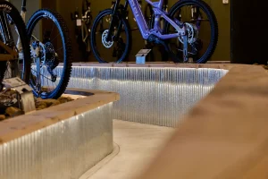 Inspired by the craftsmanship of mountain bike trail builders, commonly available materials are thoughtfully detailed and assembled to elevate the environment with custom touches and authentic character. The showroom balances functionality with a refined aesthetic, creating an inviting experience that celebrates the ARI brand, the natural landscape that influences it, and the community that gathers around it.