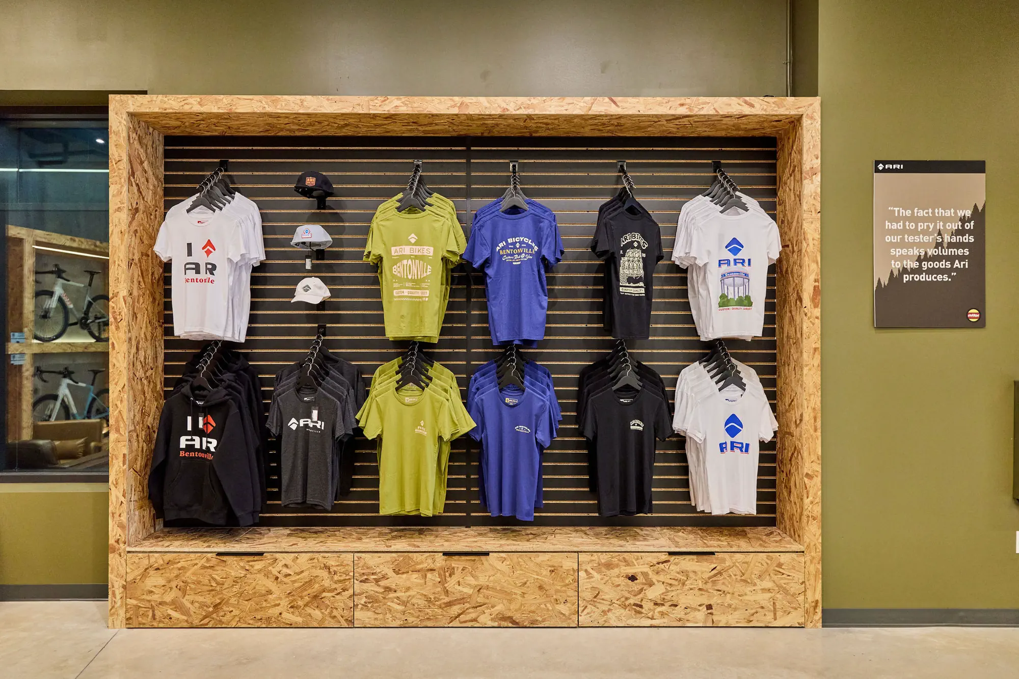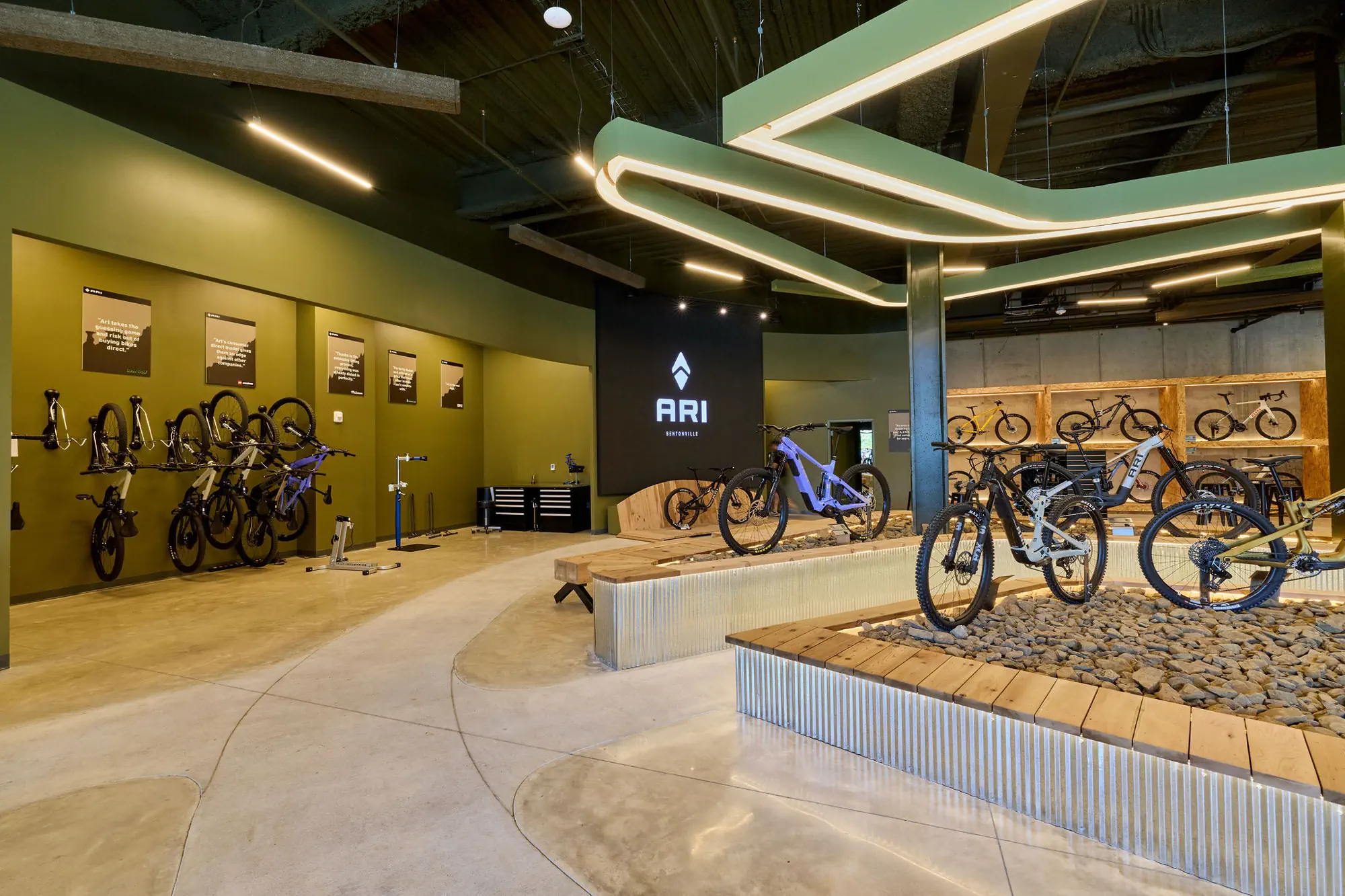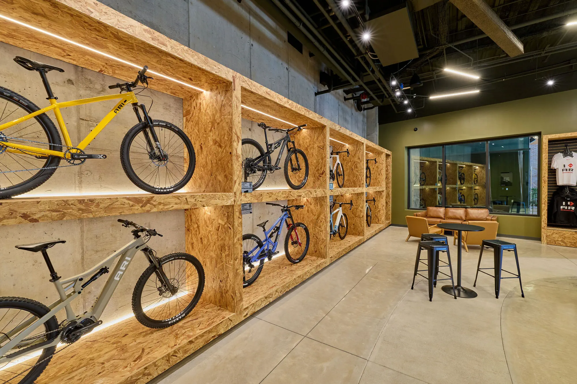 The ARI Bikes Showroom was designed to embody the brand’s top-tier standards while seamlessly integrating the rugged, rural, forested character of Arkansas. The resulting space establishes a distinct identity that stands apart from other regional retail concepts, expressing a bold yet grounded design language reflective of ARI’s ethos: Custom, Quality, Direct.