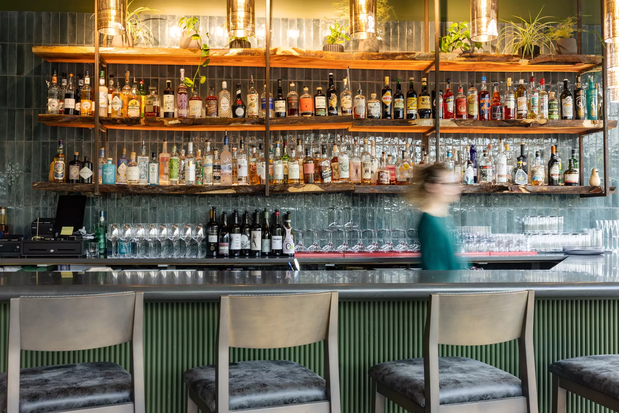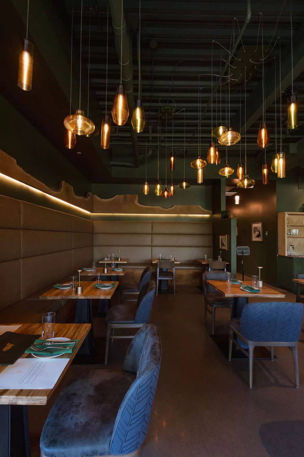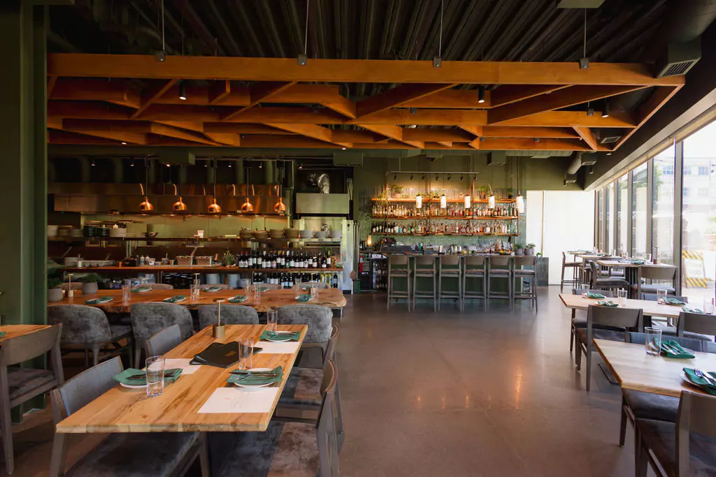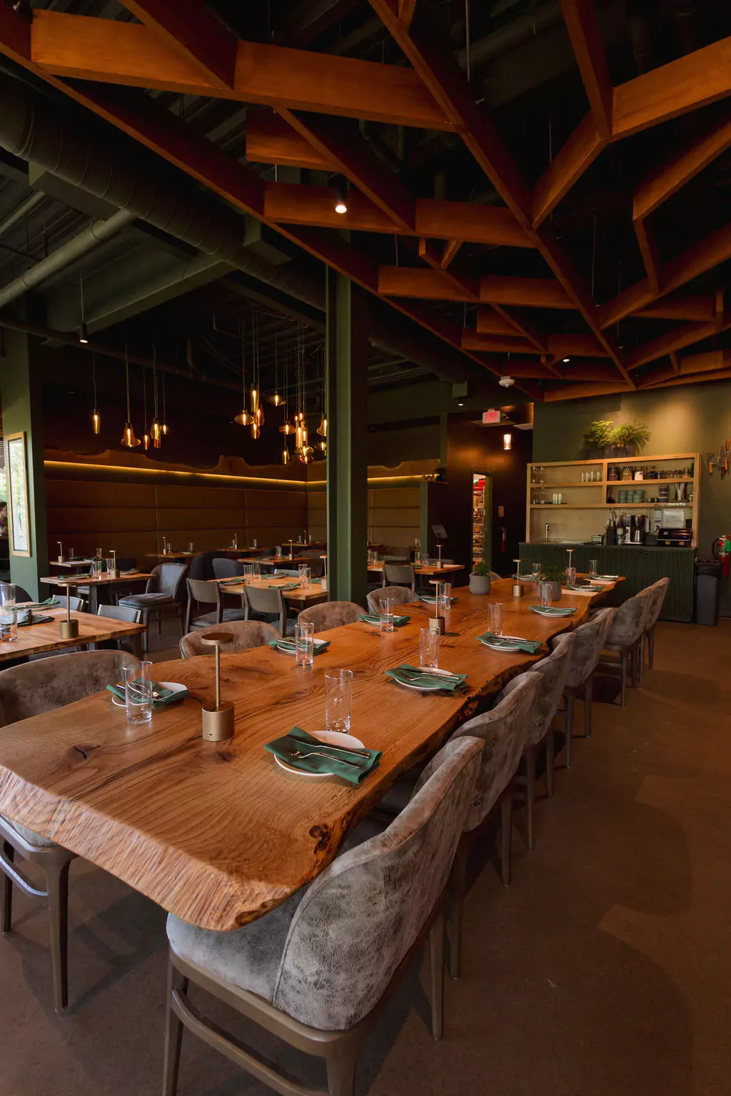 Deep green envelops the space and is layered with warm golden and brown hues reflecting the name Conifer and evoking a natural, grounded atmosphere. The overall palette and spatial organization balance and complement the full height storefront spanning from the bar to the primary entrance and encourages visual connection to the landscaped patio and dense trees beyond.