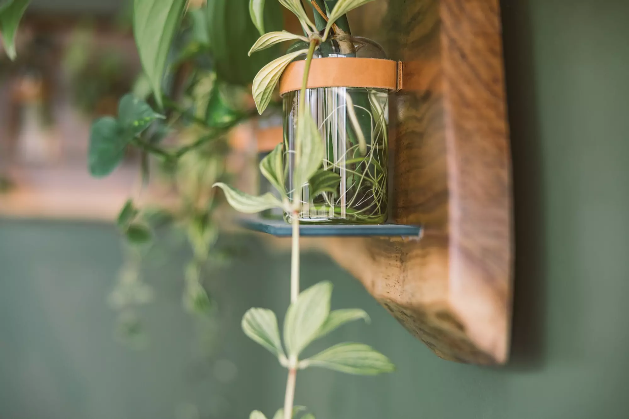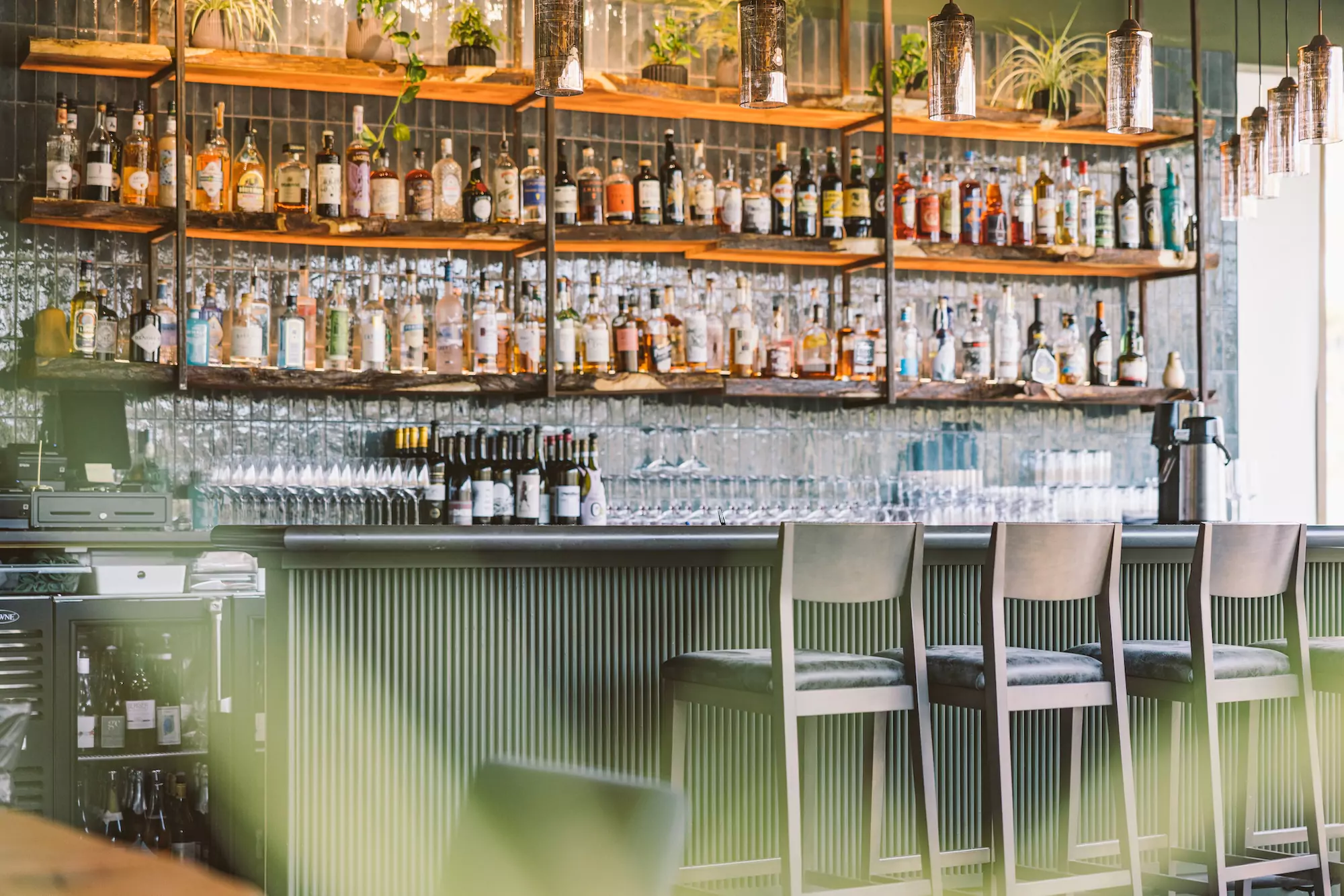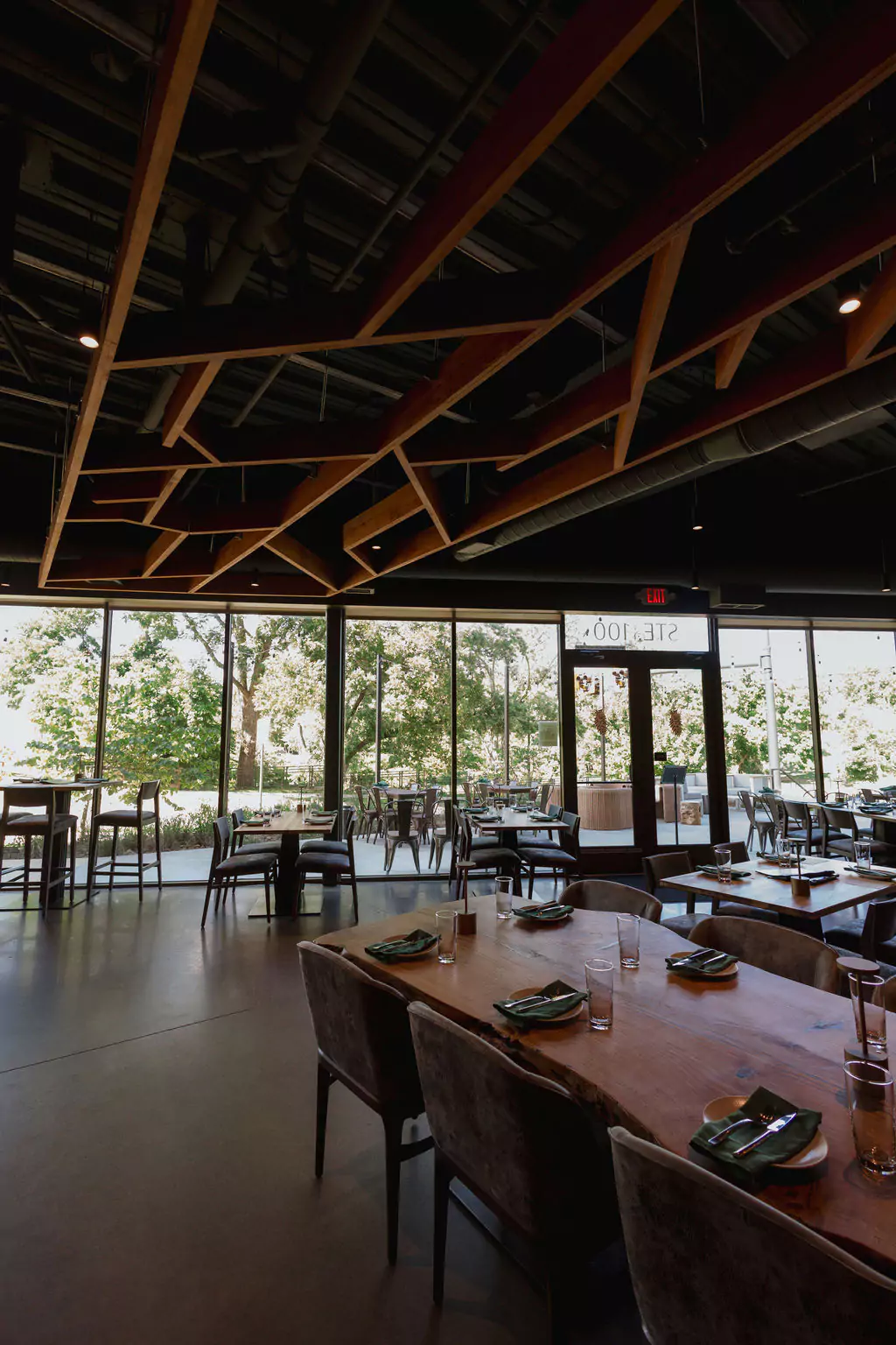 Deep green envelops the space and is layered with warm golden and brown hues reflecting the name Conifer and evoking a natural, grounded atmosphere. The overall palette and spatial organization balance and complement the full height storefront spanning from the bar to the primary entrance and encourages visual connection to the landscaped patio and dense trees beyond.