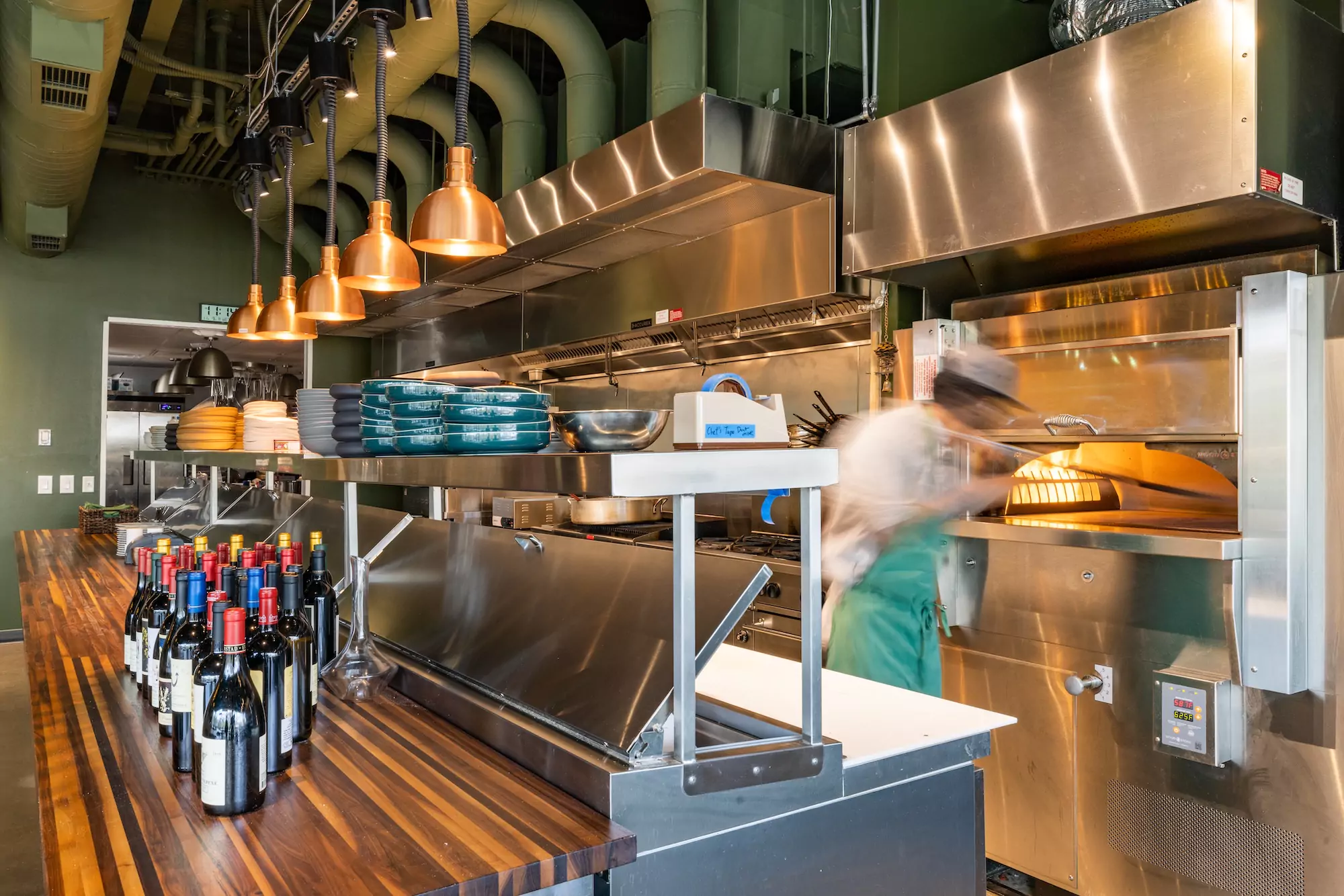 The dining room is a shared experience by all guests. As the heart of the restaurant, the open kitchen offers guests a clear view of the culinary action. Warm copper fixtures and stainless steel equipment with a locally made walnut butcherblock top span the length of the dining room directly adjacent to a massive live-edge pin oak community dining table.