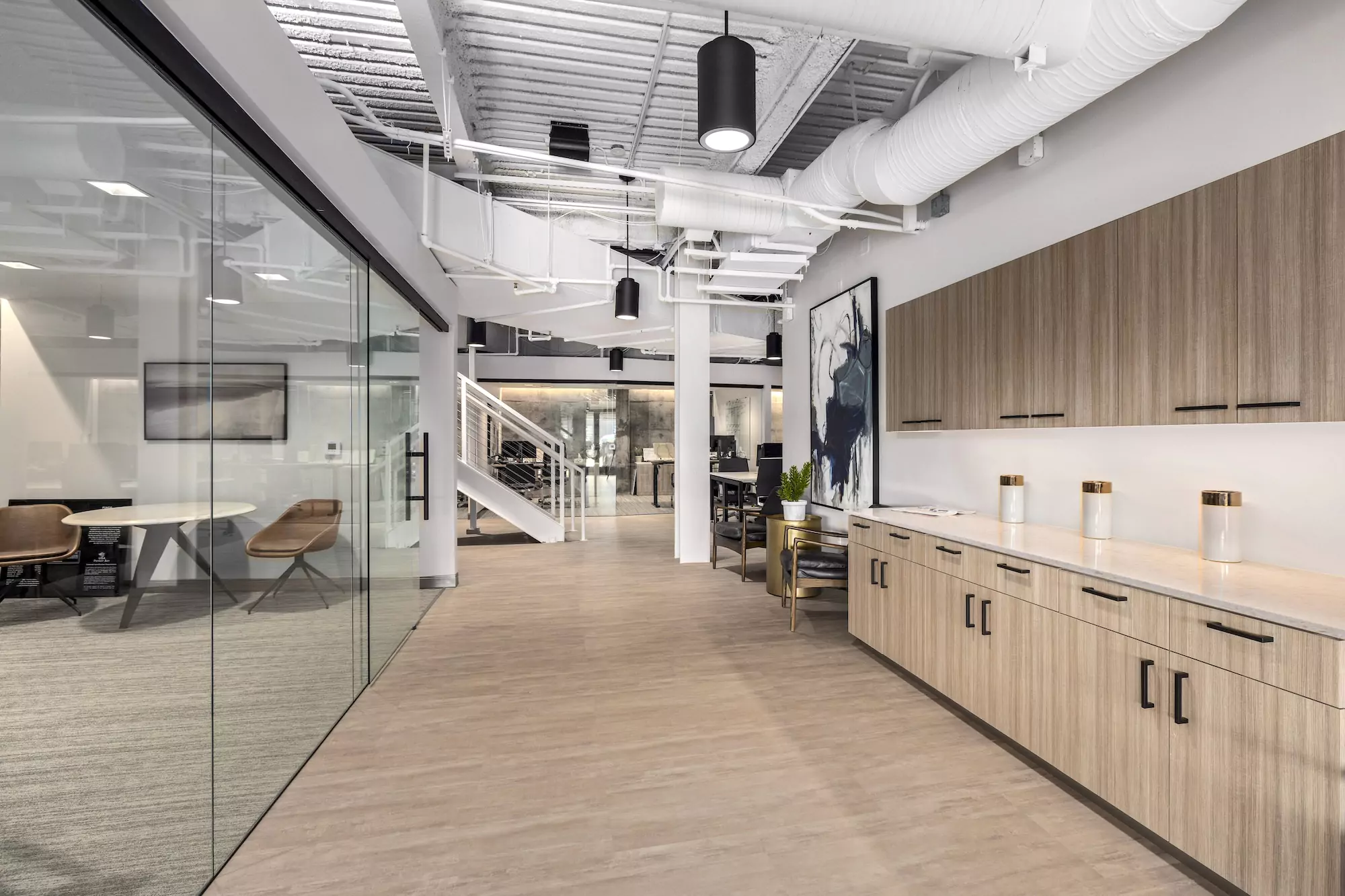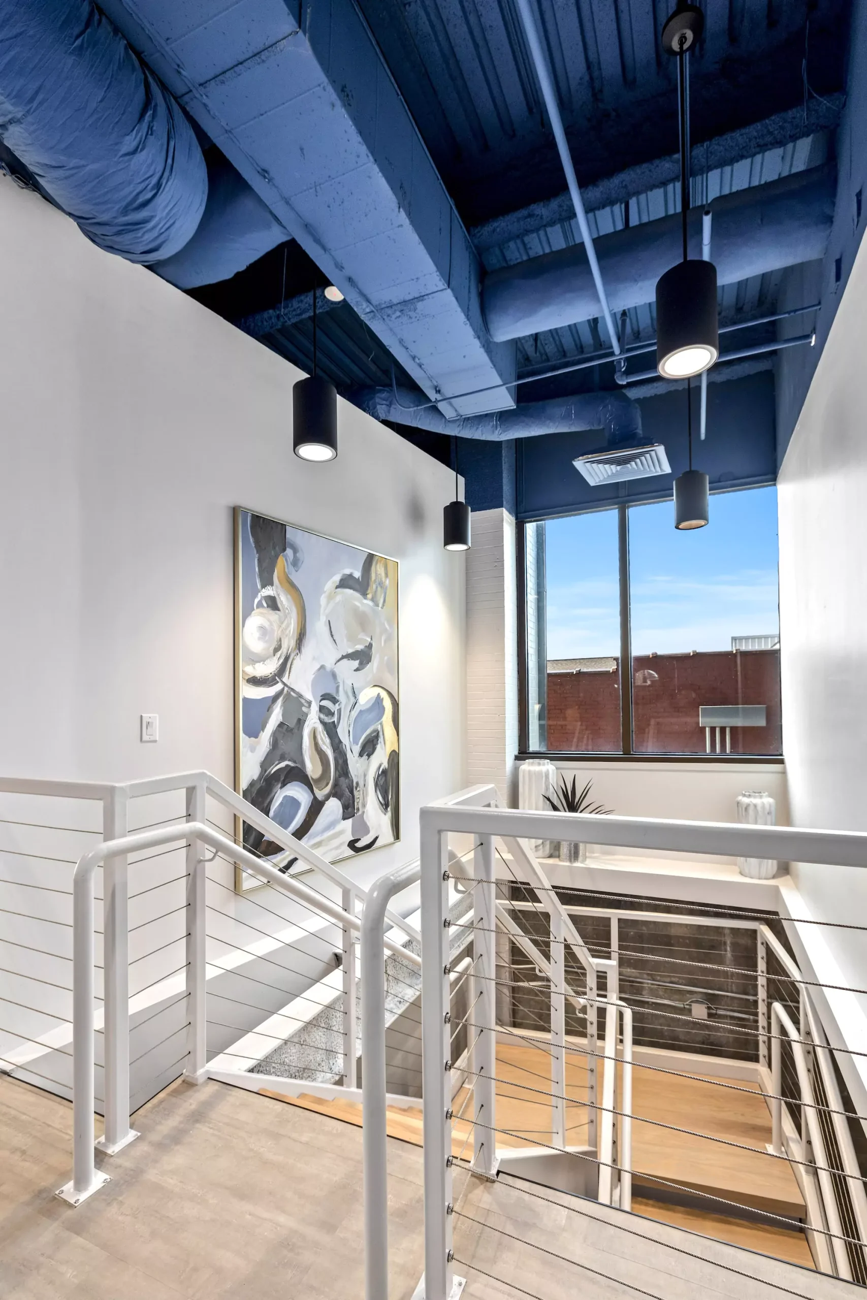 To accommodate the bank’s growth, the design expanded into two leased spaces on different floors of the iconic EJ Ball building—a former restaurant on the main floor and a former yoga studio in the basement. The need for an interior staircase to connect these levels became a unique design opportunity. The staircase not only unites the spaces but also allows natural light deeper into the basement, illuminating work areas that would otherwise be dark. This feature enhances the flow between floors, making the entire space feel cohesive and connected.