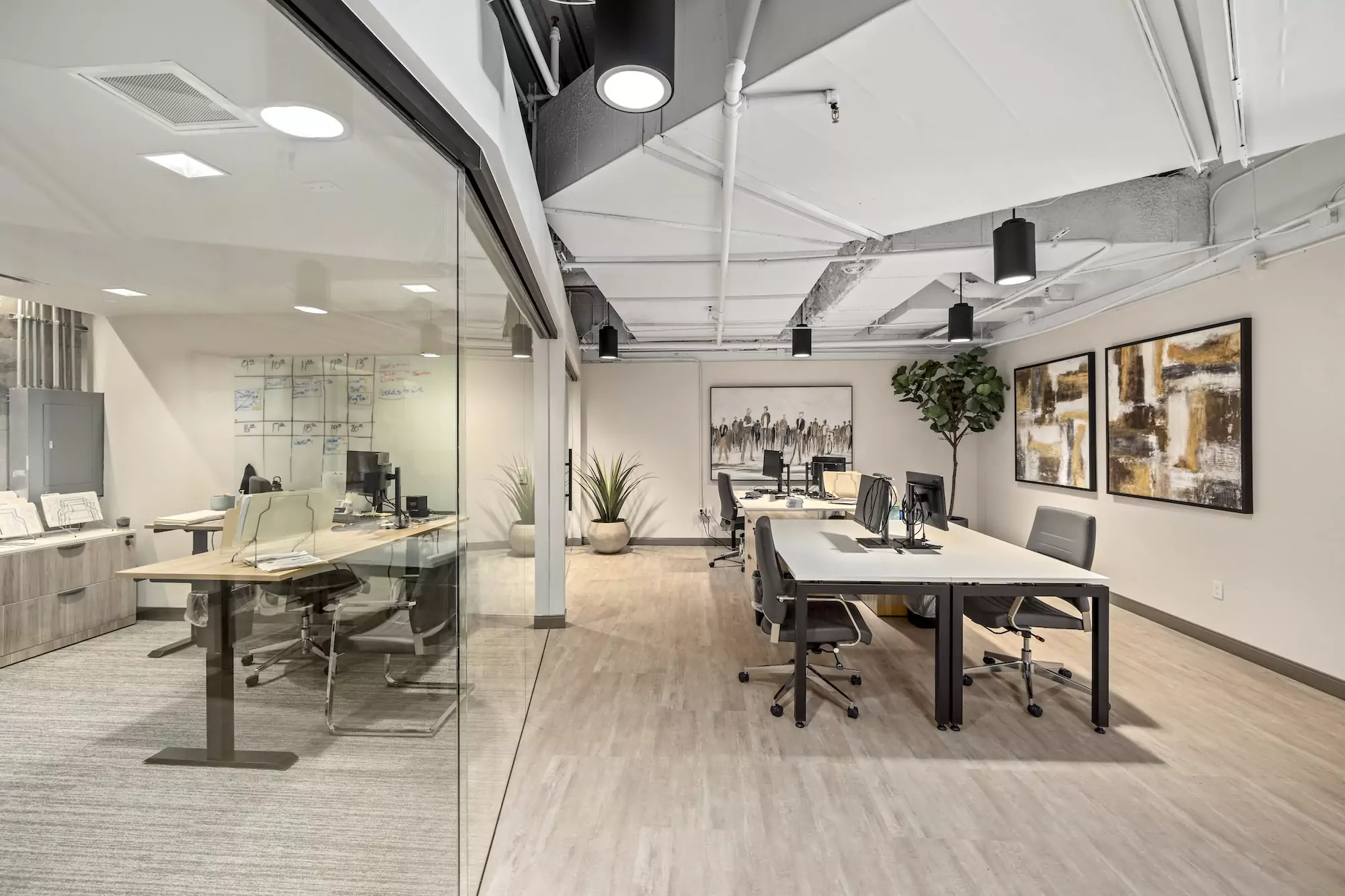 A cove light washes the existing concrete foundation walls, serving as a backdrop to the offices. This subtle lighting highlights the raw beauty of the building’s structure, emphasizing the charm of adaptive reuse projects. By showcasing these exposed elements, the design tells a story of transformation—where history meets modern functionality, creating a dynamic and comfortable environment for both staff and clients.