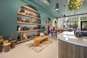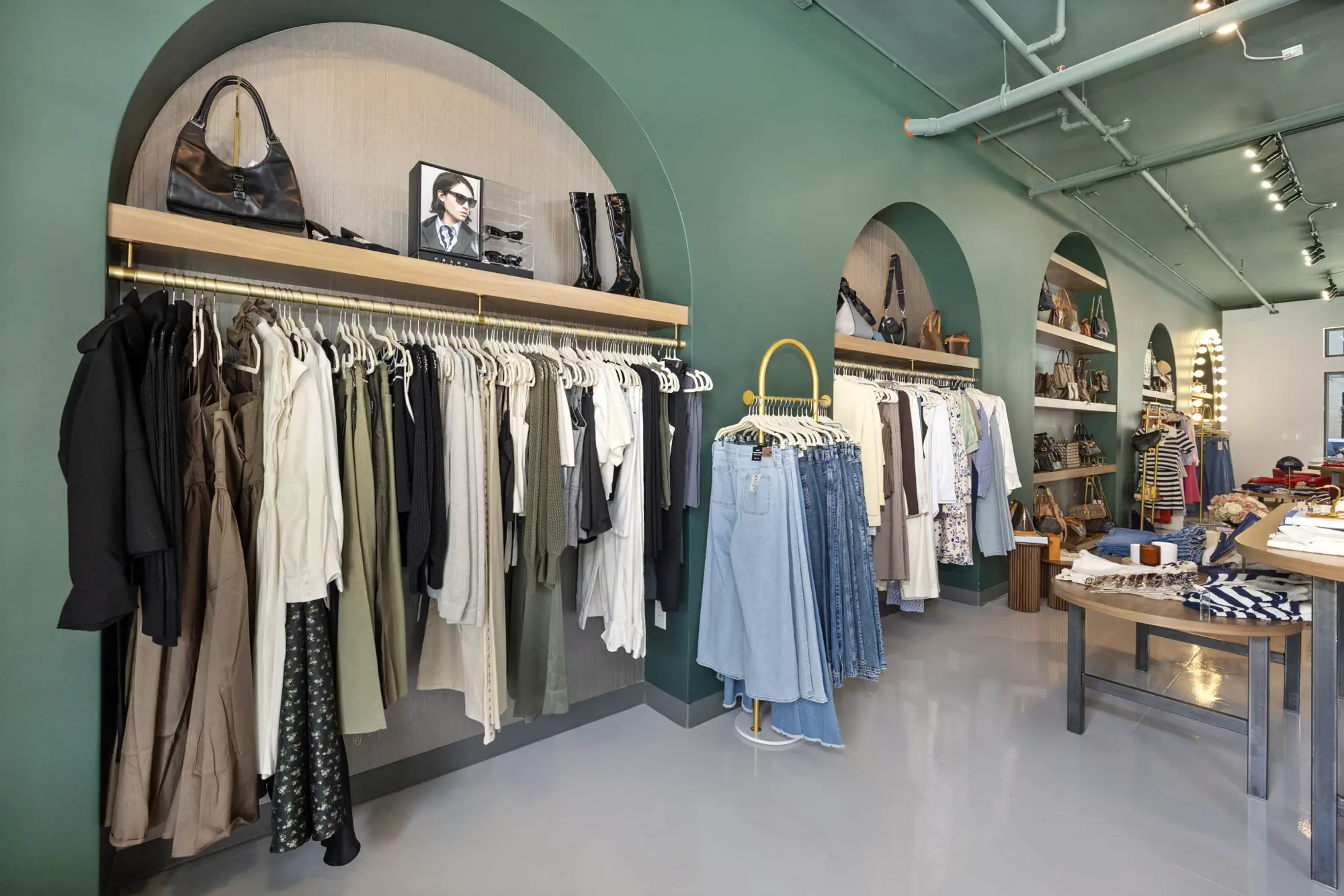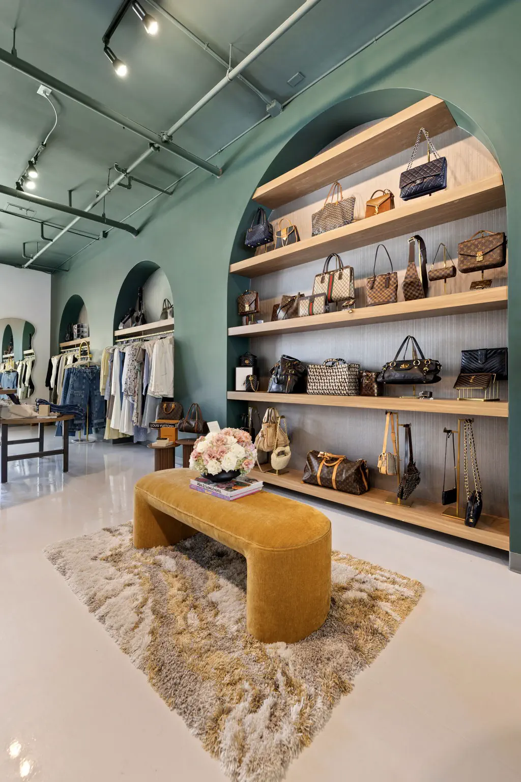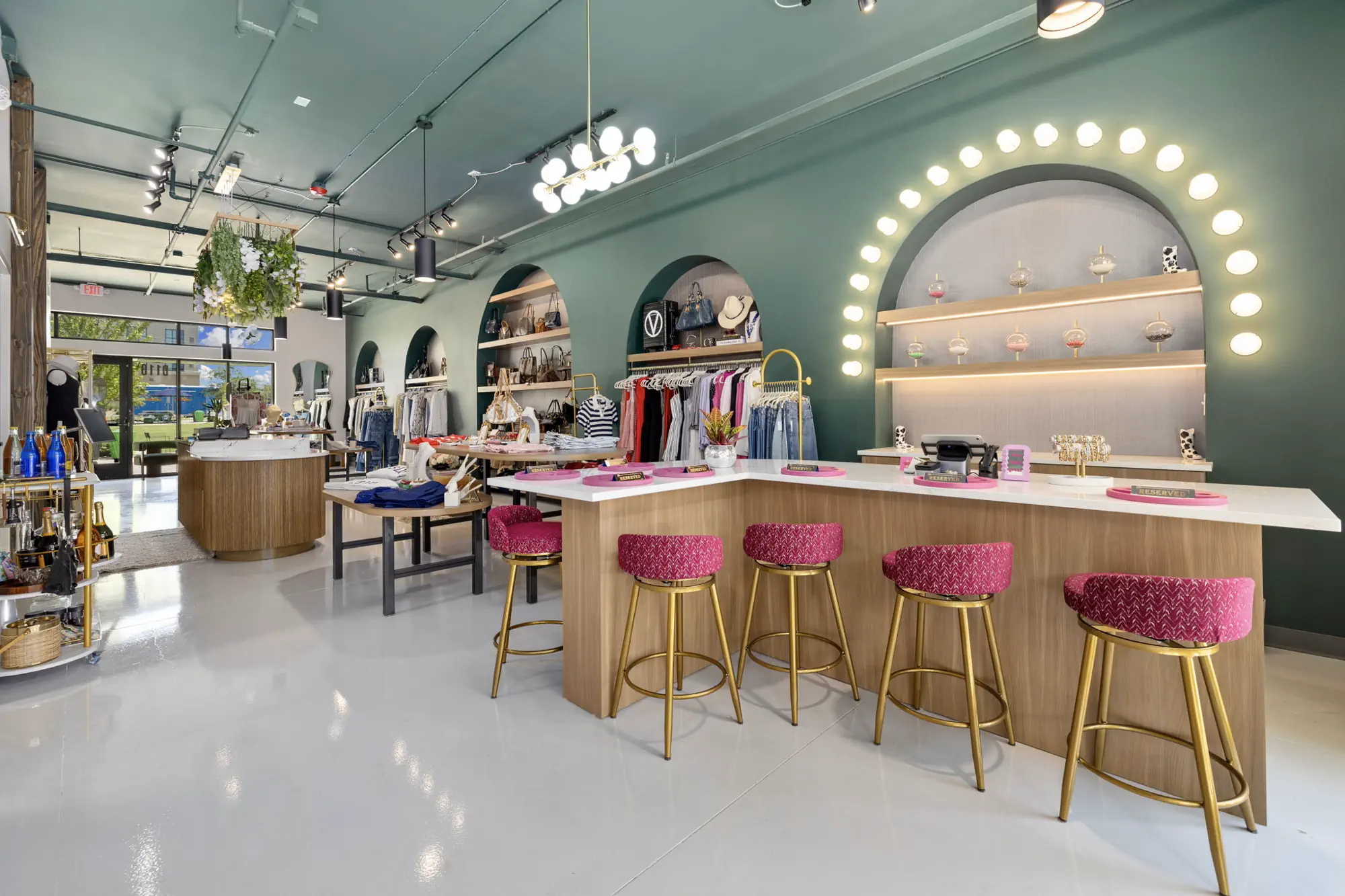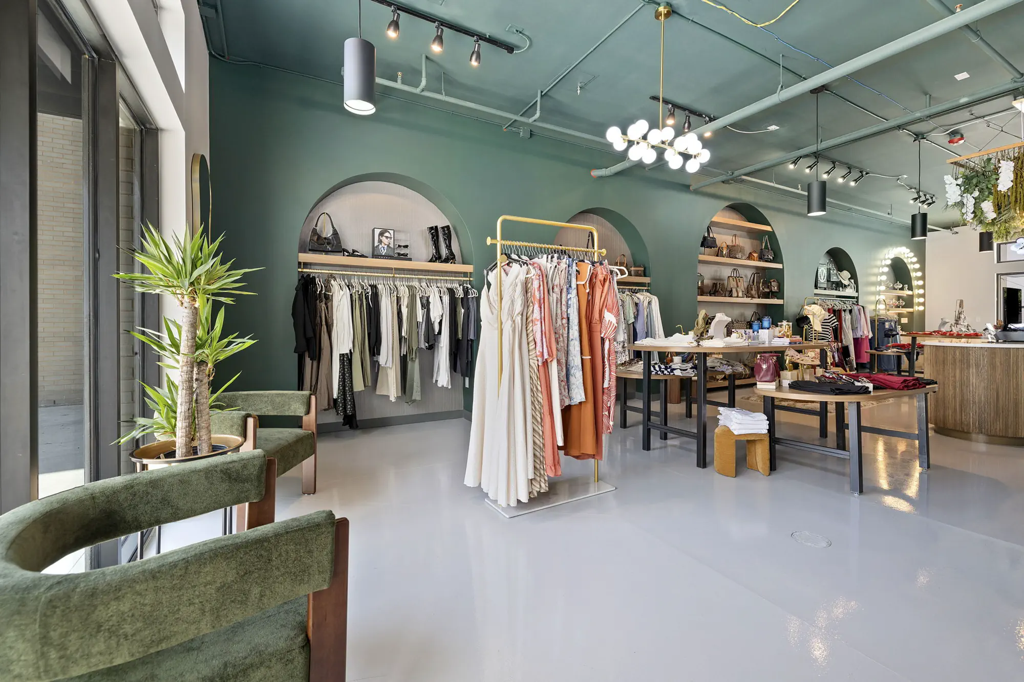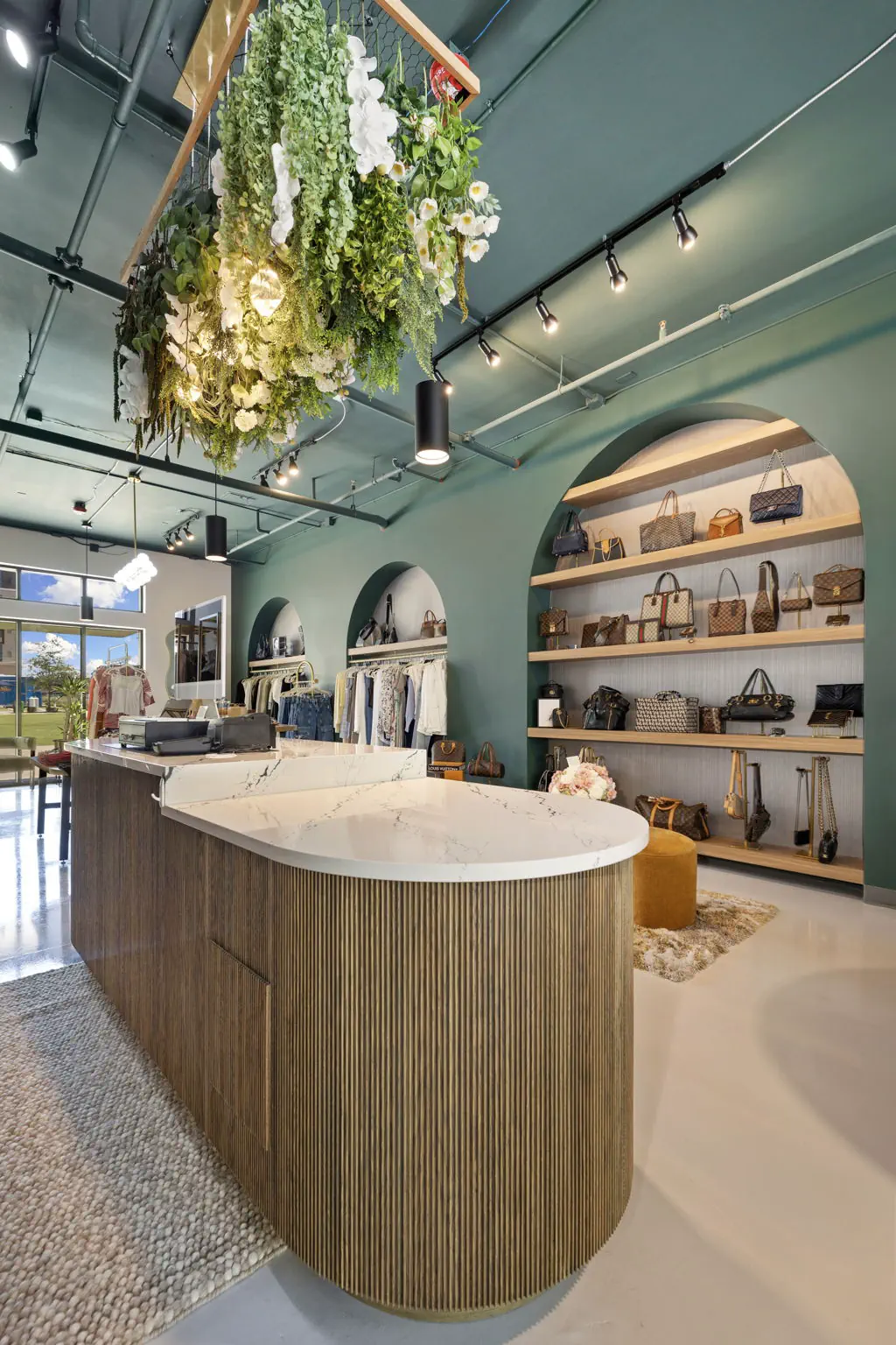 This space is a true reflection of the Henry Ellis brand, from color choices and all the way down to the green and gold veined quartz used on the center P.O.S. station; this space exudes elegance. When entering you see a long wall lined with arched openings that display handbags, shoes, and hanging clothes.