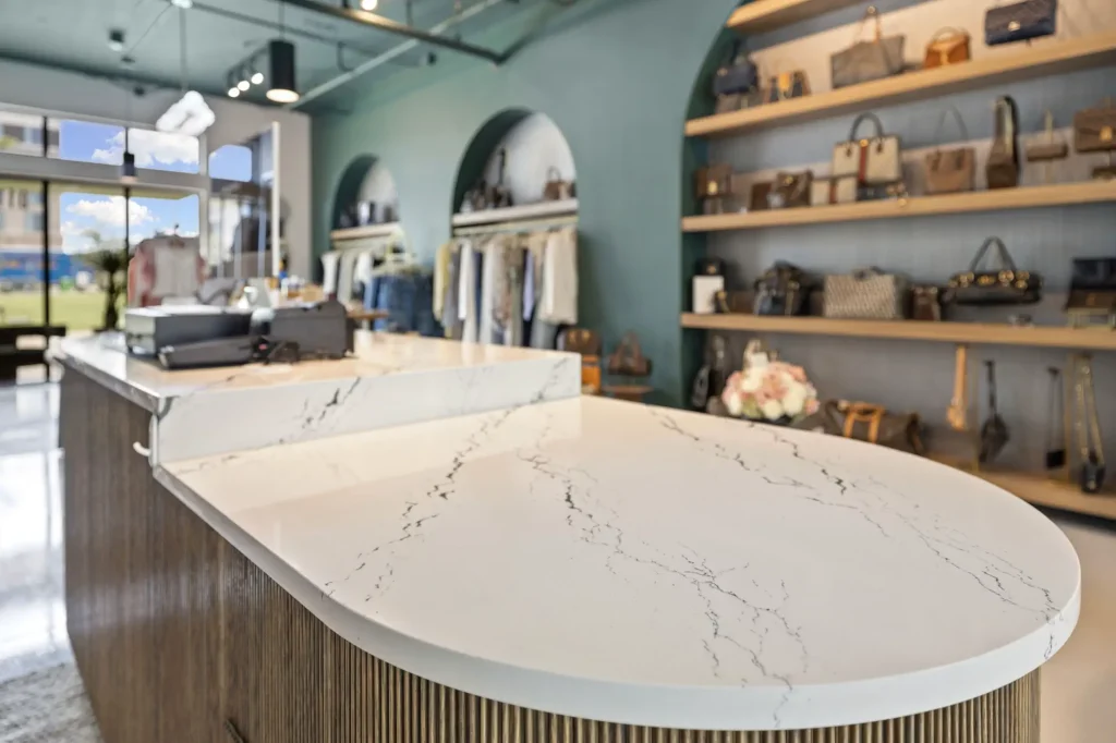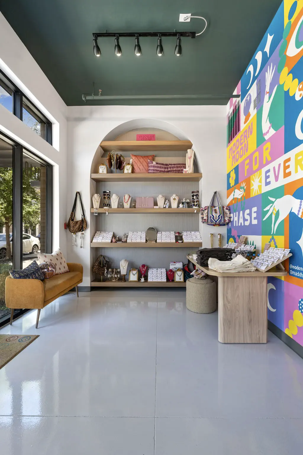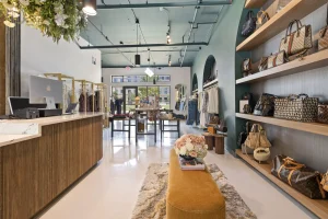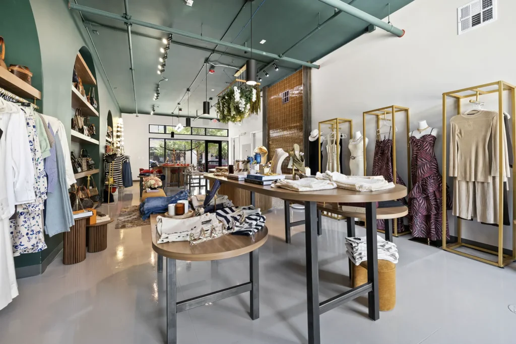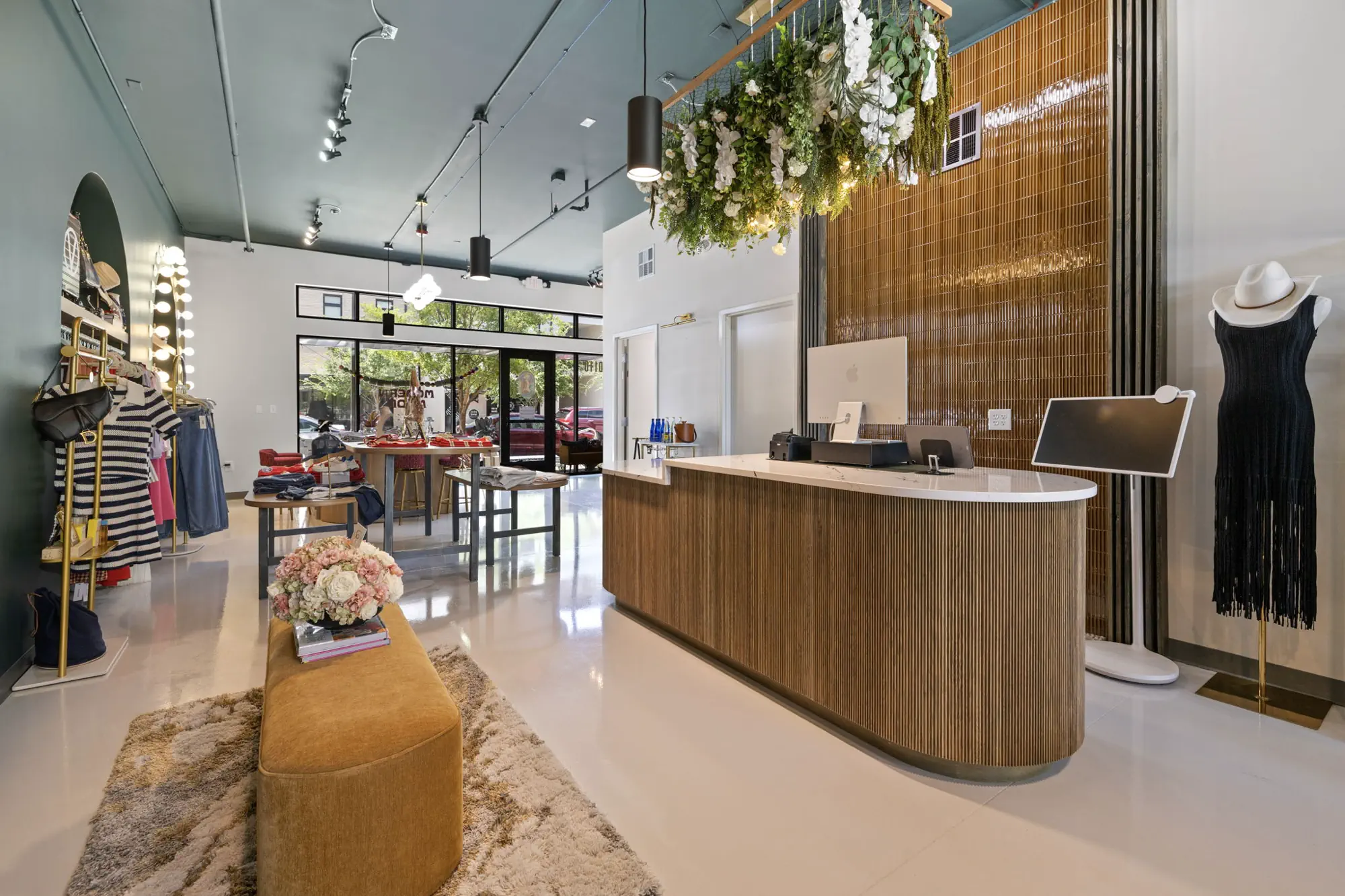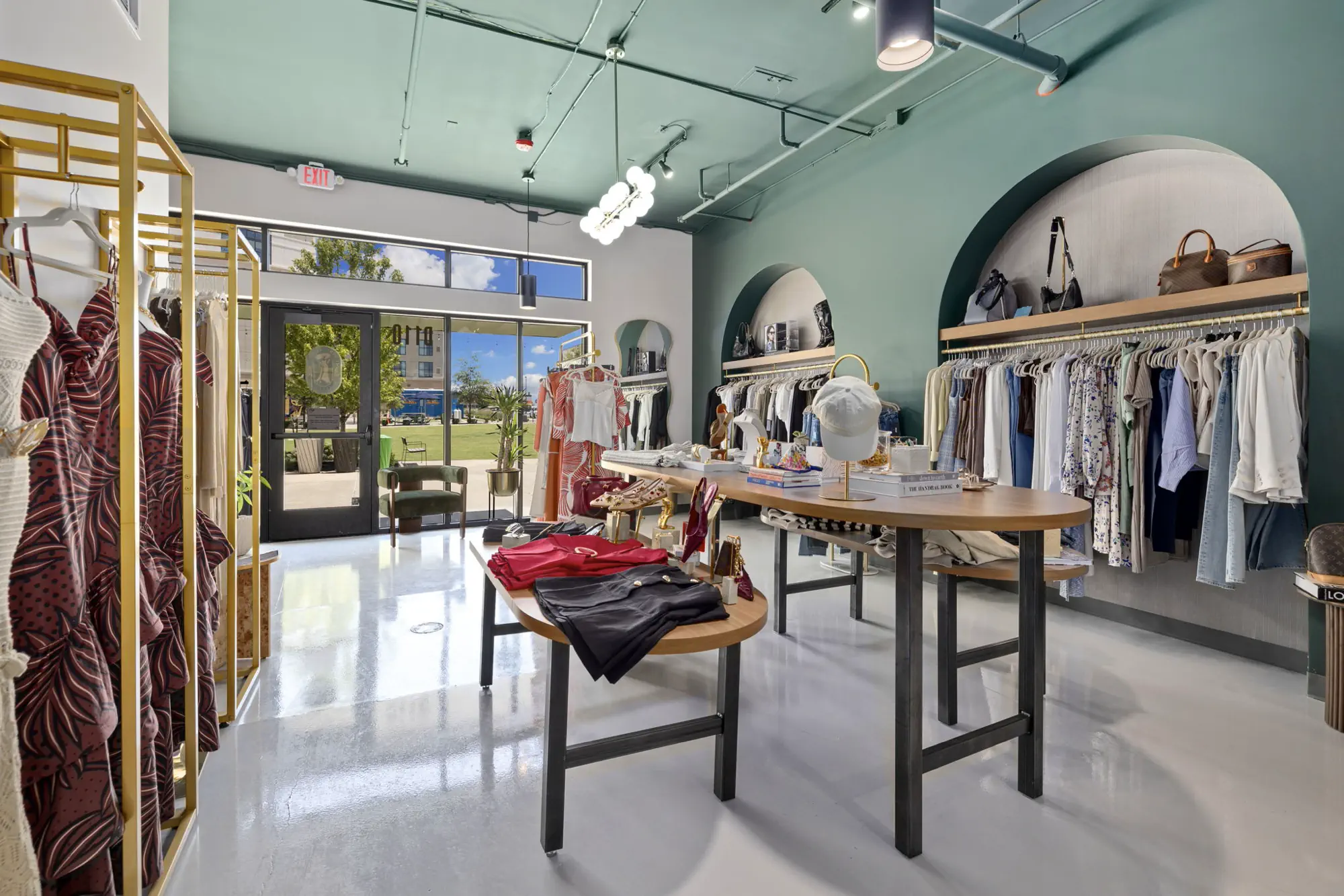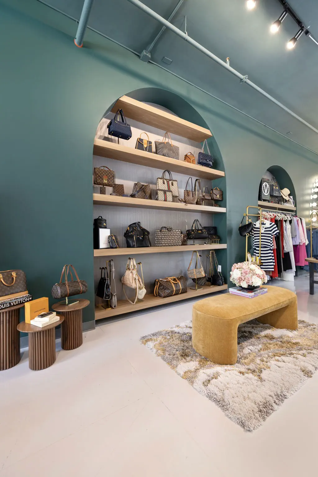 This space is a true reflection of the Henry Ellis brand, from color choices and all the way down to the green and gold veined quartz used on the center P.O.S. station; this space exudes elegance. When entering you see a long wall lined with arched openings that display handbags, shoes, and hanging clothes.