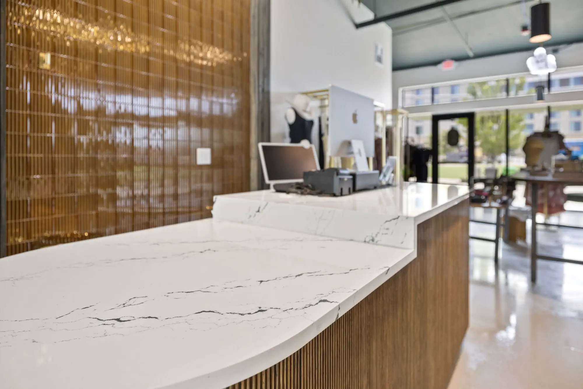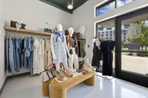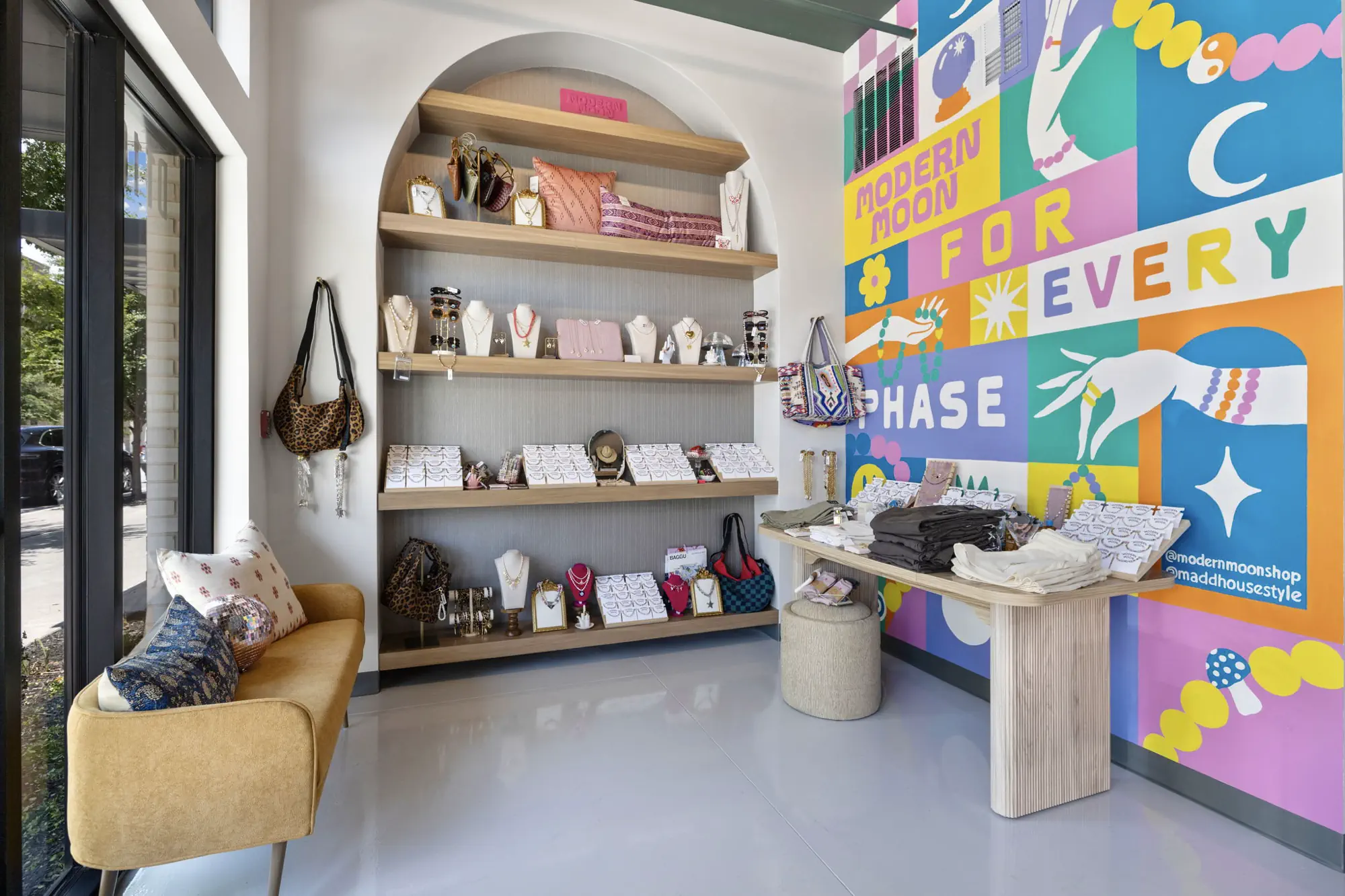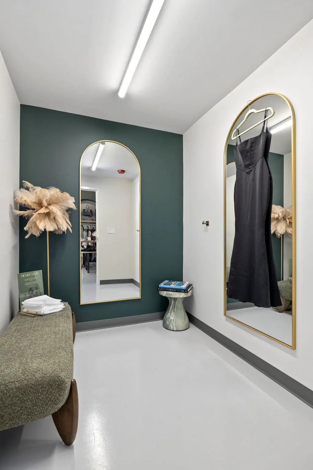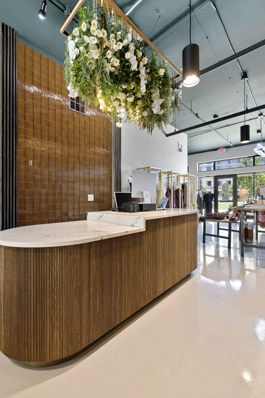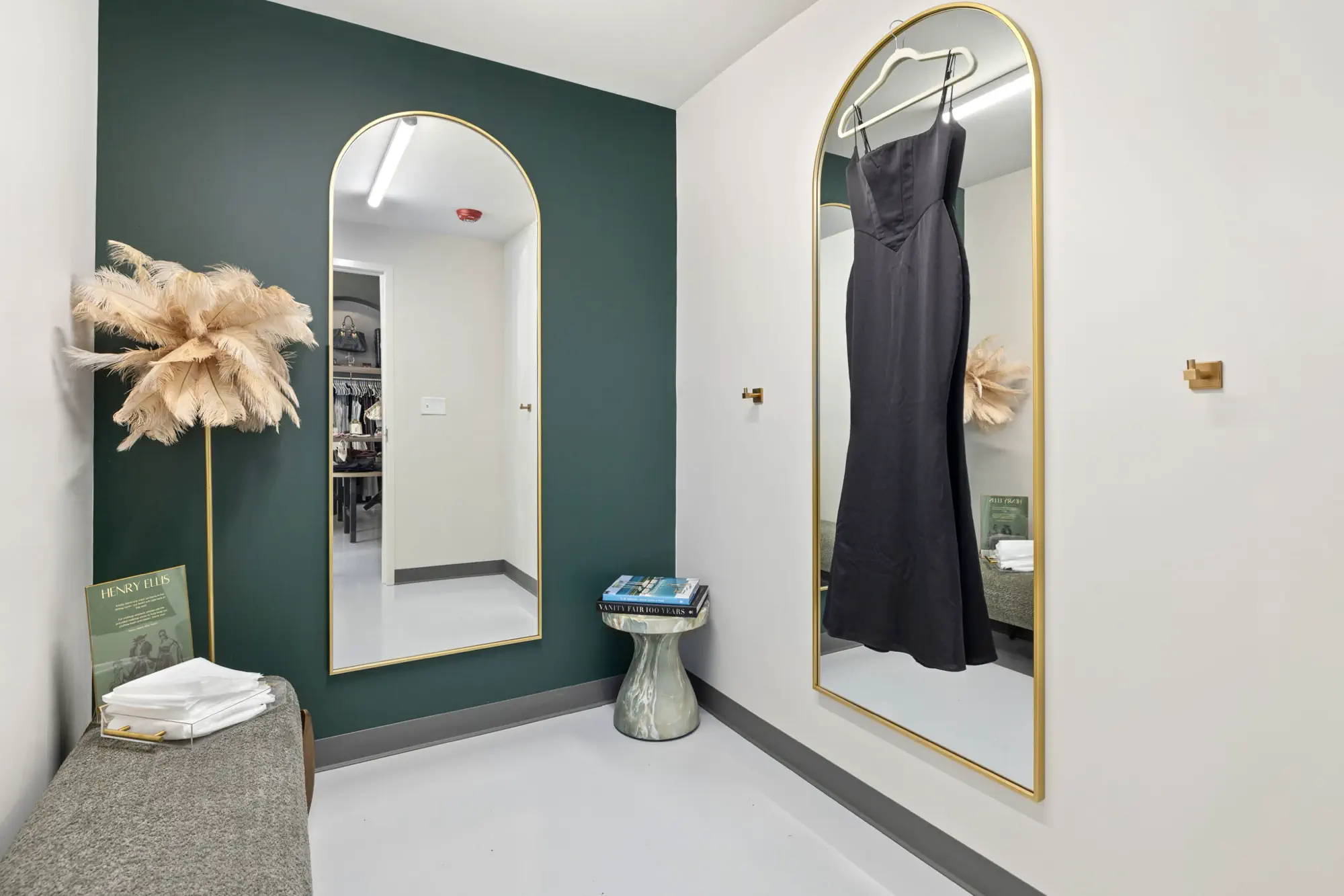 This space is a true reflection of the Henry Ellis brand, from color choices and all the way down to the green and gold veined quartz used on the center P.O.S. station; this space exudes elegance. When entering you see a long wall lined with arched openings that display handbags, shoes, and hanging clothes.