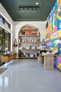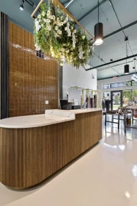 The designer’s scope of work included curating a material palette that reflected the brand’s identity, space planning, 3D renderings, and construction documents (floor plan, reflected ceiling plan, interior elevations, casework details, interior details, and finish plan and schedule).