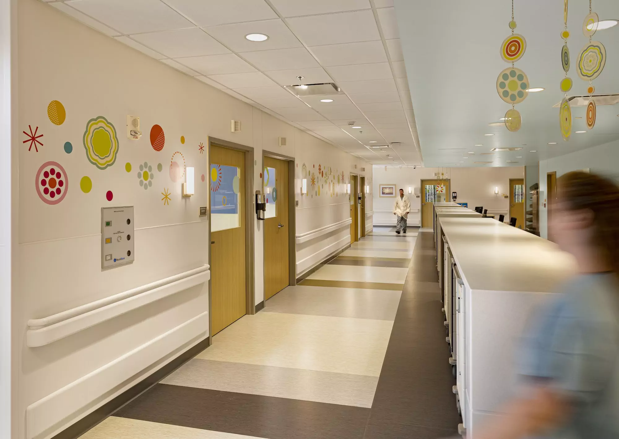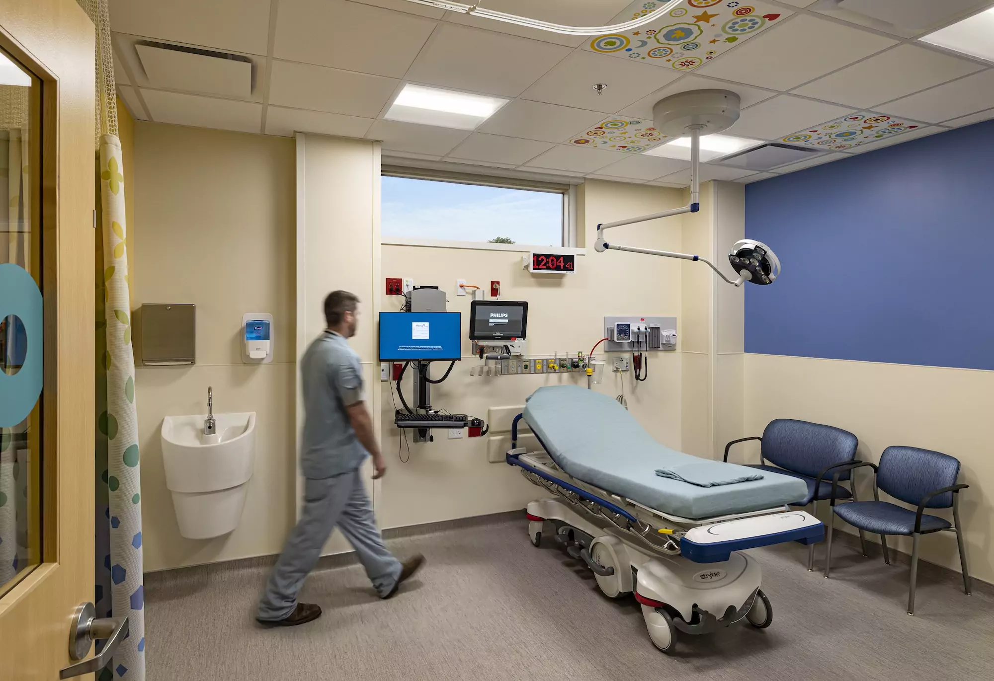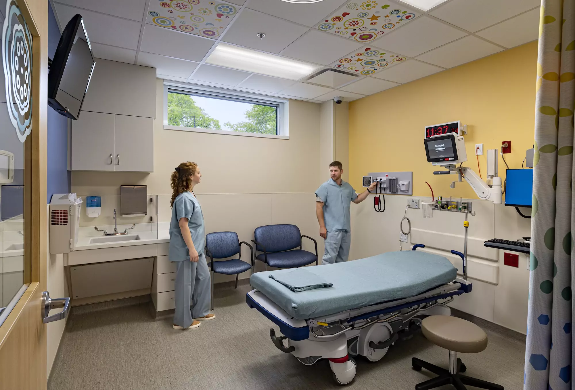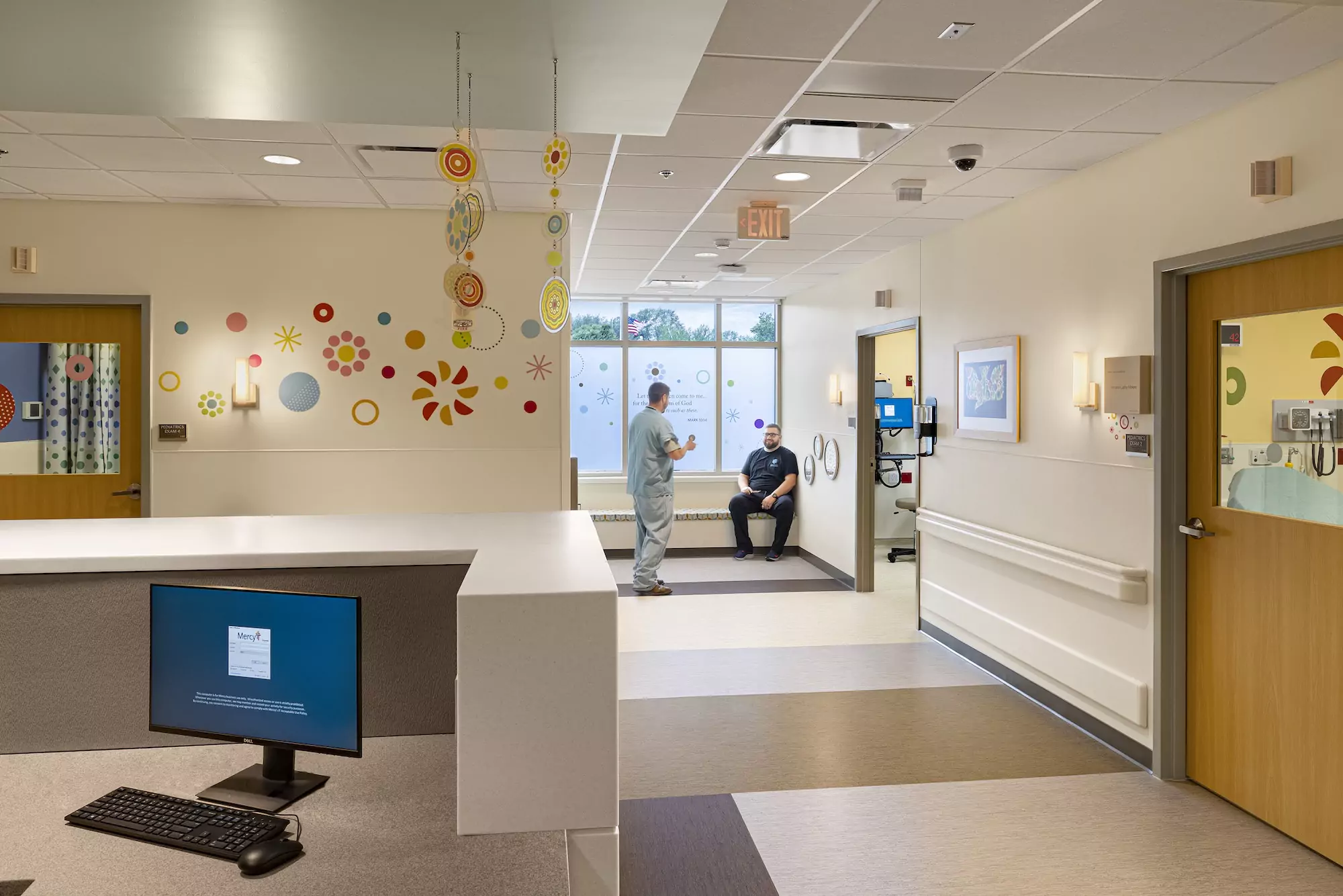 In 2021, BUF team members designed an innovative Mercy Pediatric Emergency Room with a compact footprint, prioritizing efficiency and functionality. The expansion included 11 pediatric exam bays, with two specially tailored to meet the needs of children requiring mental health care. The flexible layout accommodates fluctuations in patient volume and staffing. Additional amenities include a welcoming main entry with a modern canopy, a streamlined reception and registration area, and separate adult and pediatric waiting rooms to foster a more comfortable and supportive environment for patients and their families.