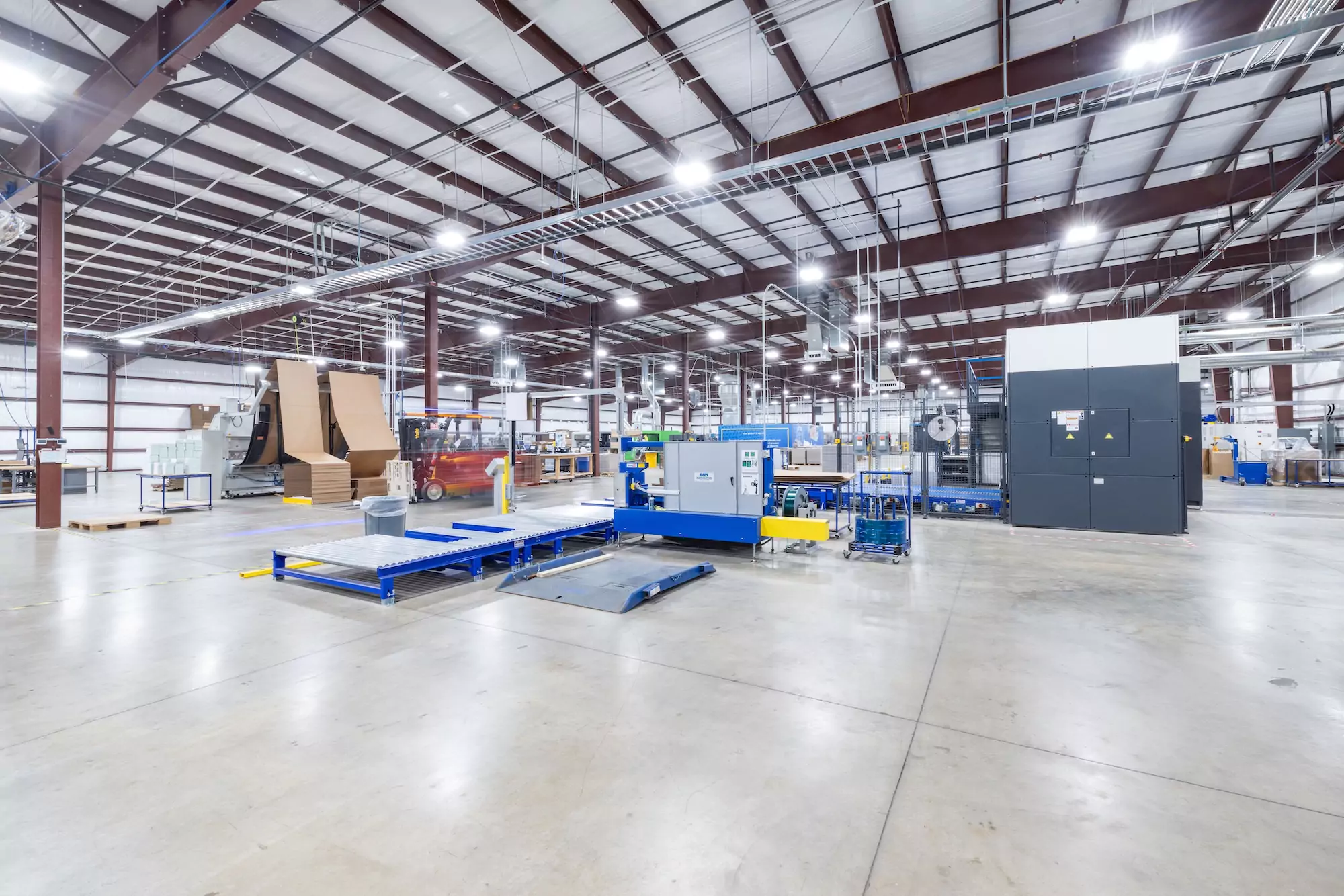 The facility uses an L-shape building design where the short leg of the L houses all inbound/raw material. The long leg of the L houses outbound and production areas encompassing 47,000 of the 59,000 square feet and includes two massive print presses and a multitude of scoring, cutting, folding, and gluing equipment. The front of house caps the long leg of the L creating the front façade for the facility that doubles as the outbound service exit for freight when completed on the production floor.