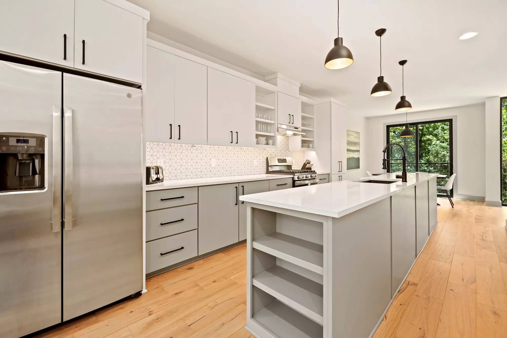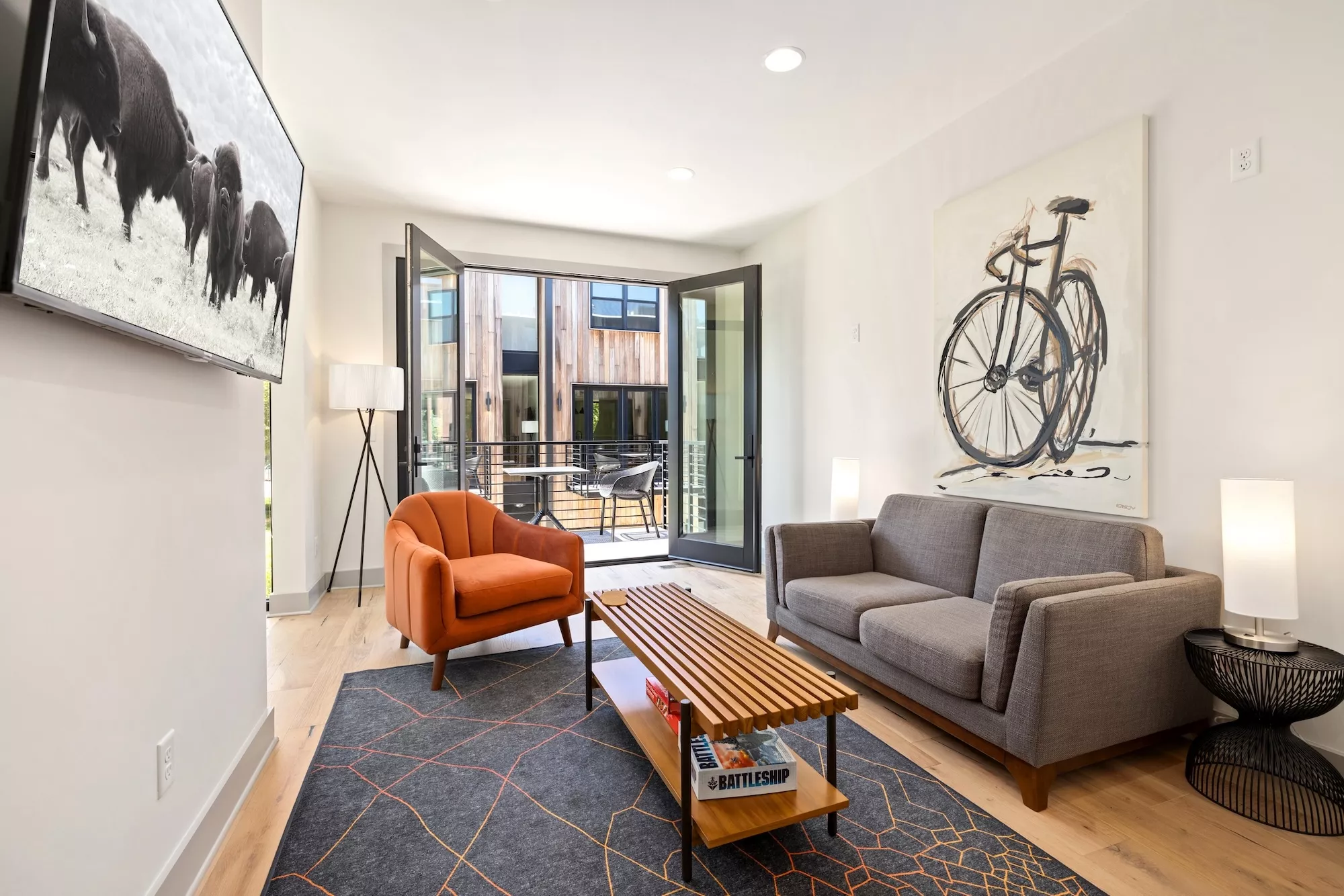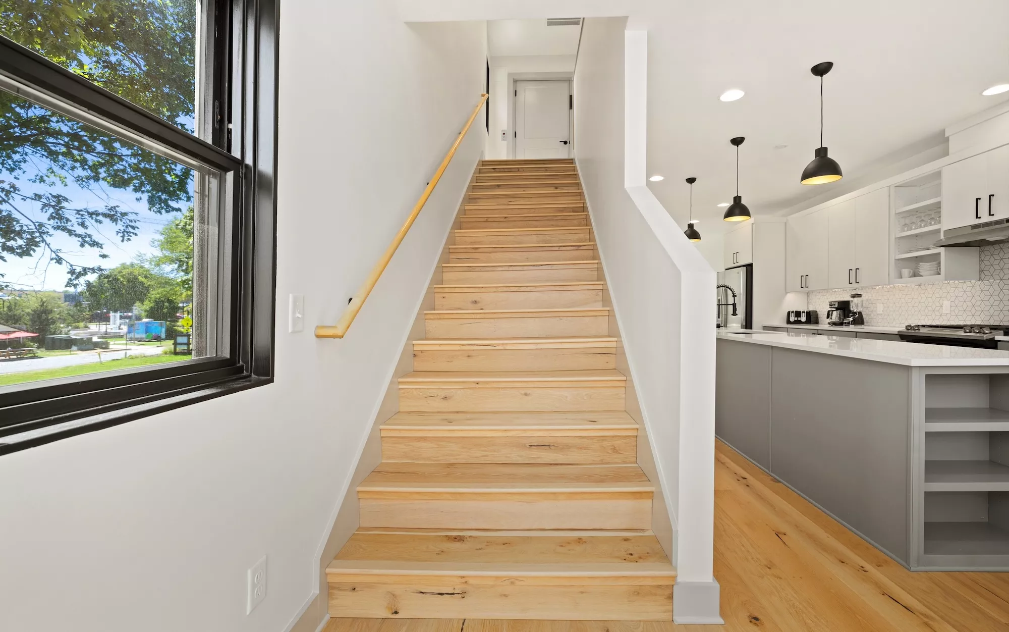 Large storefront with metal spandrel panels juxtaposed with the wood cladding creates a clear line between units, while also bringing in light and creating views out over nature and trail. Powder-coated metal screens at the entryways and a cantilevered balcony over the garages define outdoor spaces for each unit. The interior finish details were kept minimal and neutral with bright whites and cool grey tones allowing the warmth of the wood floor to shine and the connection to the natural surroundings to be amplified.