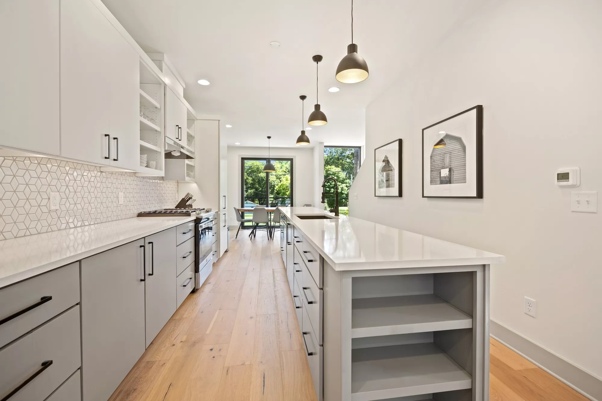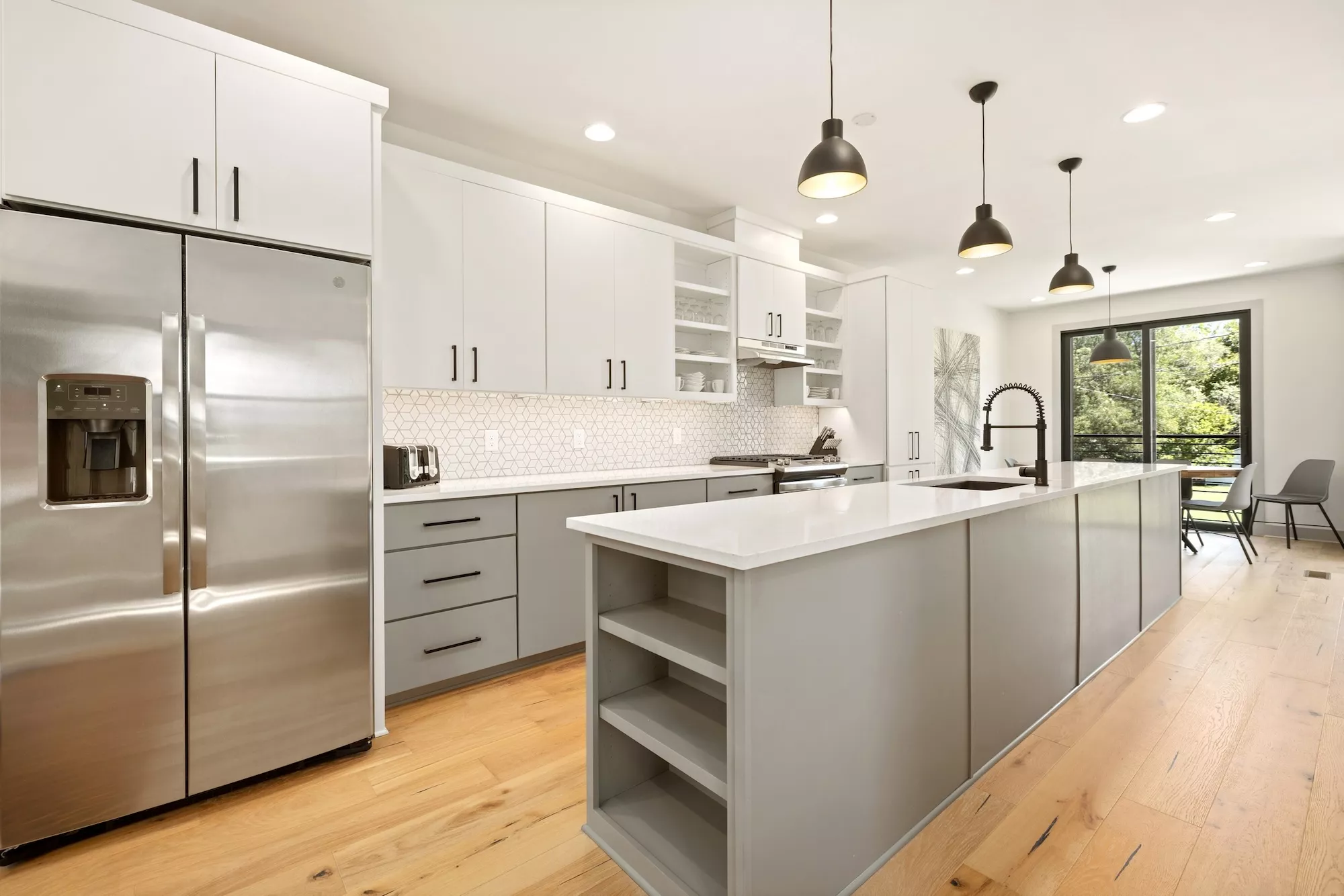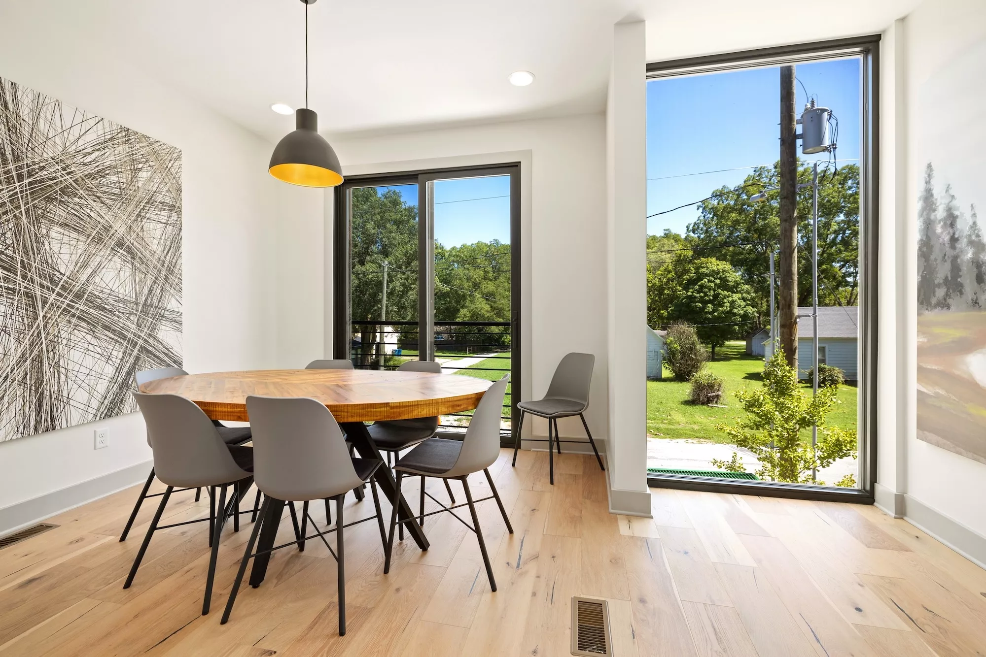 Large storefront with metal spandrel panels juxtaposed with the wood cladding creates a clear line between units, while also bringing in light and creating views out over nature and trail. Powder-coated metal screens at the entryways and a cantilevered balcony over the garages define outdoor spaces for each unit. The interior finish details were kept minimal and neutral with bright whites and cool grey tones allowing the warmth of the wood floor to shine and the connection to the natural surroundings to be amplified.