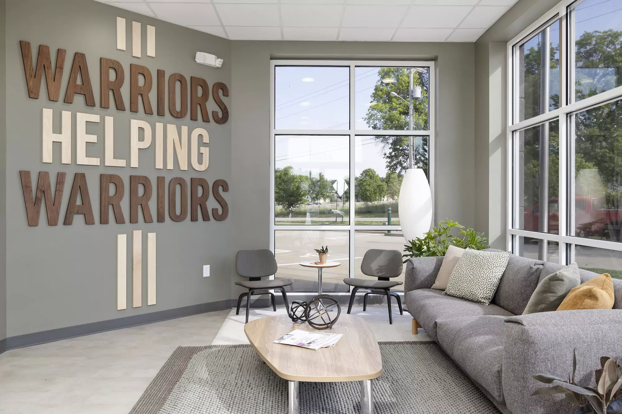 The design approach focused on creating a welcoming environment for veterans seeking support. Soft materials and warm accent trim were incorporated throughout, particularly in the entry area, to establish an inviting atmosphere for those accessing TWJ’s services. While exterior modifications were kept minimal with selective painting, the interior received thoughtful updates to ensure a comfortable and supportive environment.