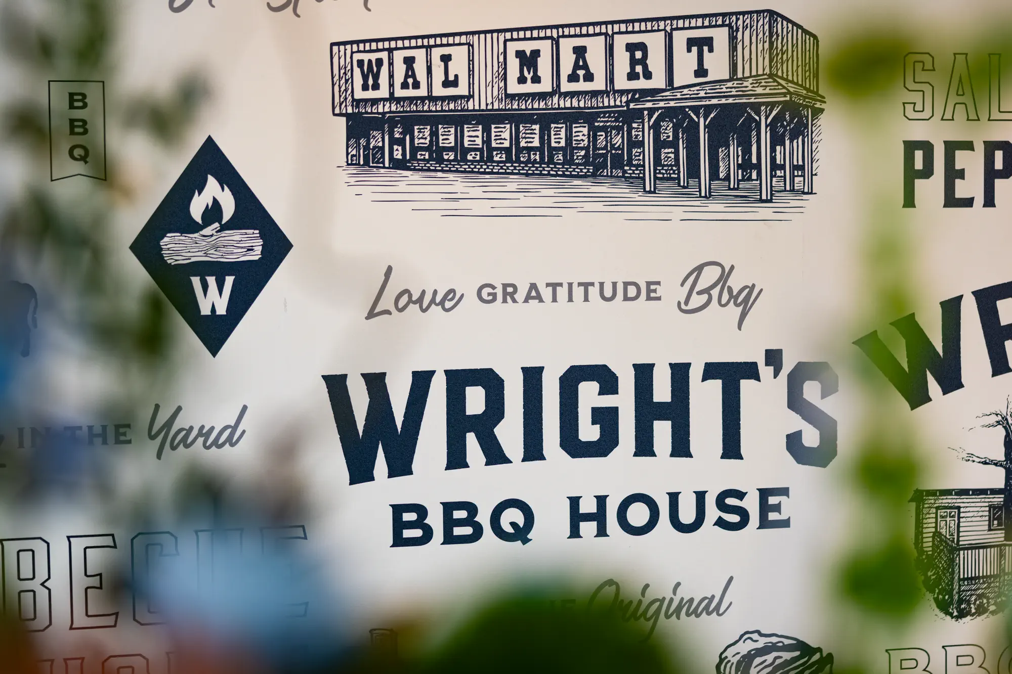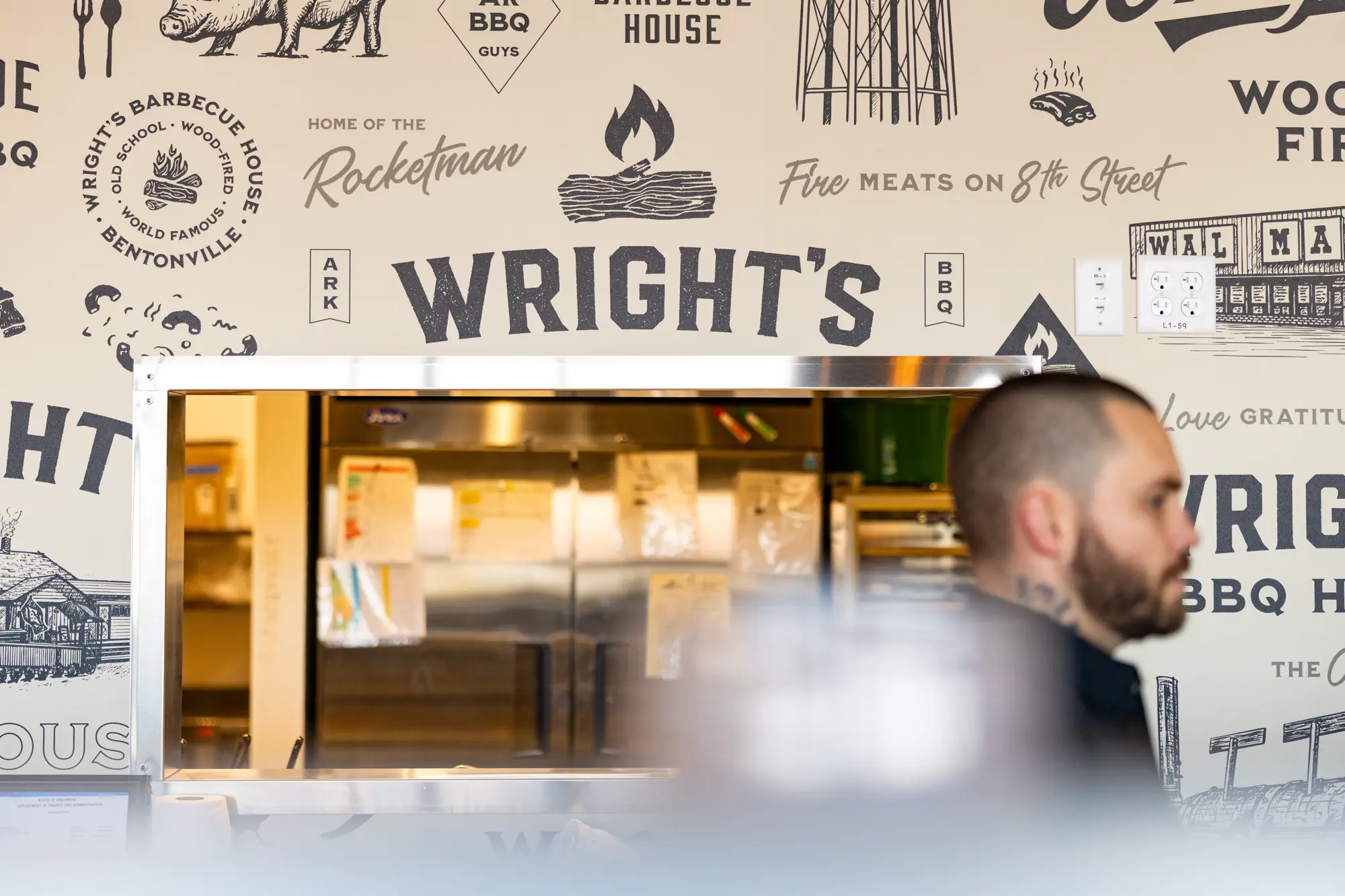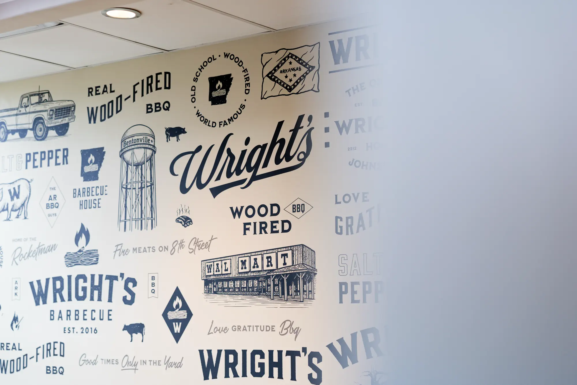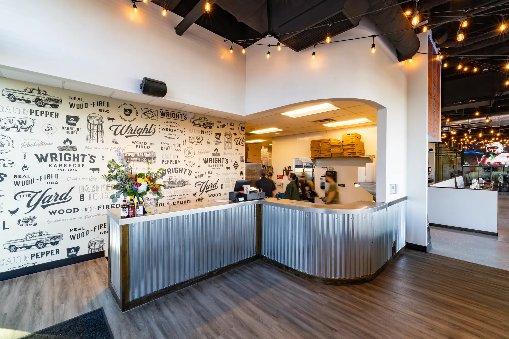 A recently completed restaurant for Wright’s BBQ is located on the Walmart Home Office Campus in the heart of Bentonville, Arkansas. Located just minutes away from the town square, the Wright’s BBQ location on campus is the perfect local spot to enjoy some barbecue and feel immersed in the Wright’s experience in a new way and atmosphere. Beautiful design features include a variety of seating options holding up to 138 customers, string lights, large video screens to watch games, custom designed merchandise shelving, and a materials palette that is cohesive with the Wright’s branding.
