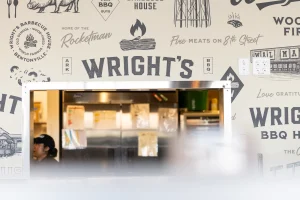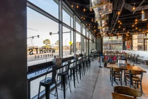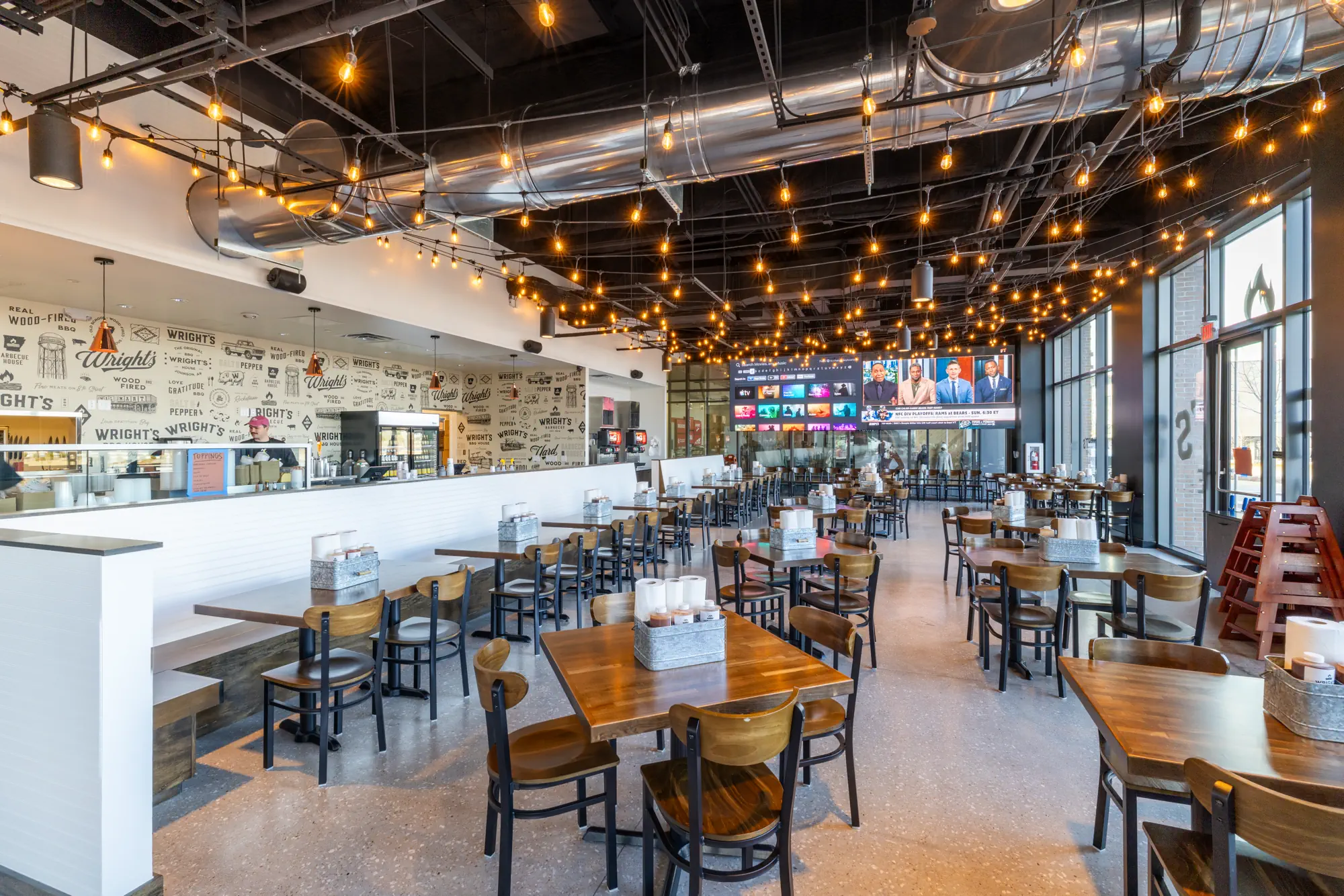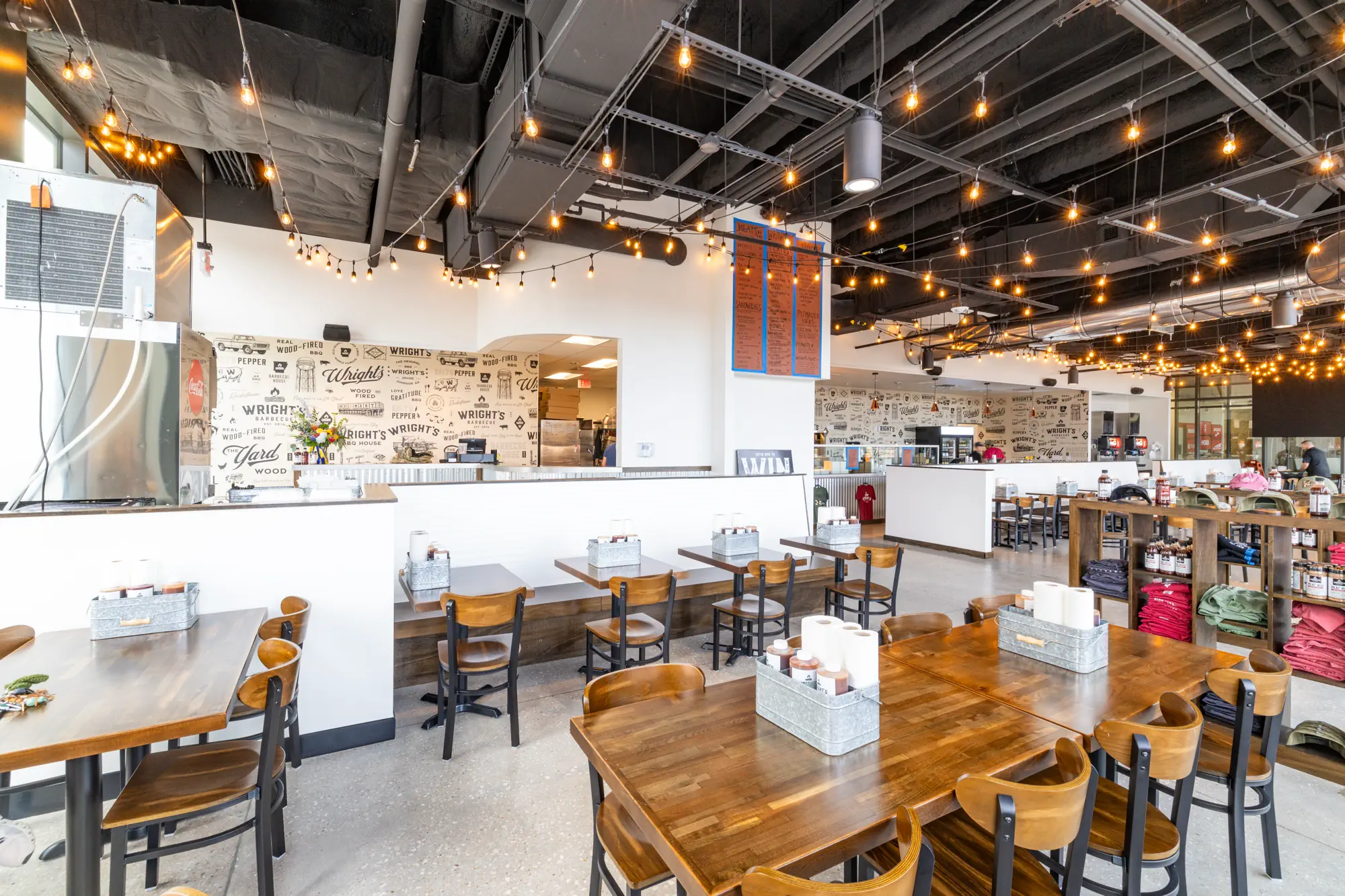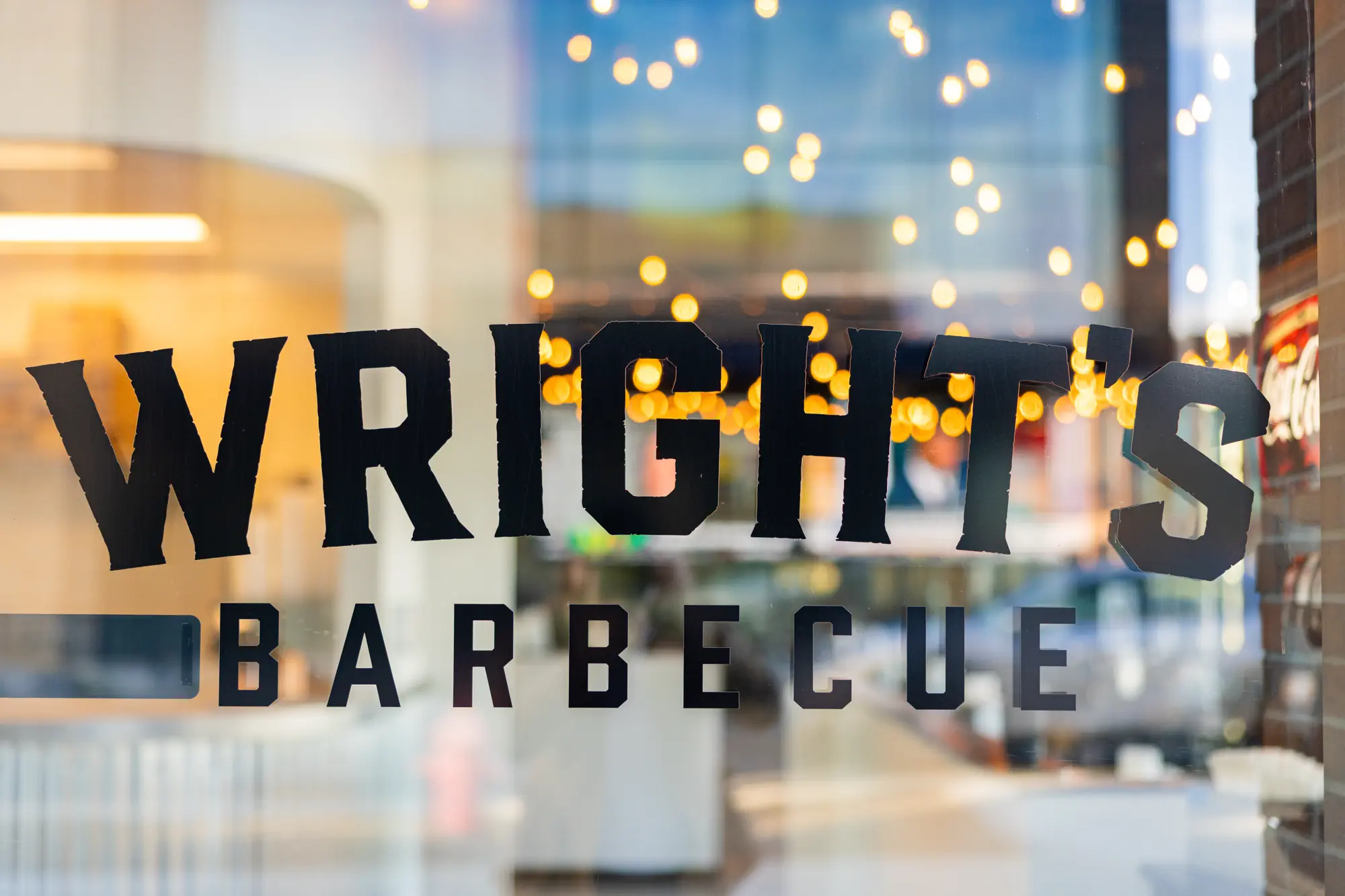 A recently completed restaurant for Wright’s BBQ is located on the Walmart Home Office Campus in the heart of Bentonville, Arkansas. Located just minutes away from the town square, the Wright’s BBQ location on campus is the perfect local spot to enjoy some barbecue and feel immersed in the Wright’s experience in a new way and atmosphere. Beautiful design features include a variety of seating options holding up to 138 customers, string lights, large video screens to watch games, custom designed merchandise shelving, and a materials palette that is cohesive with the Wright’s branding.