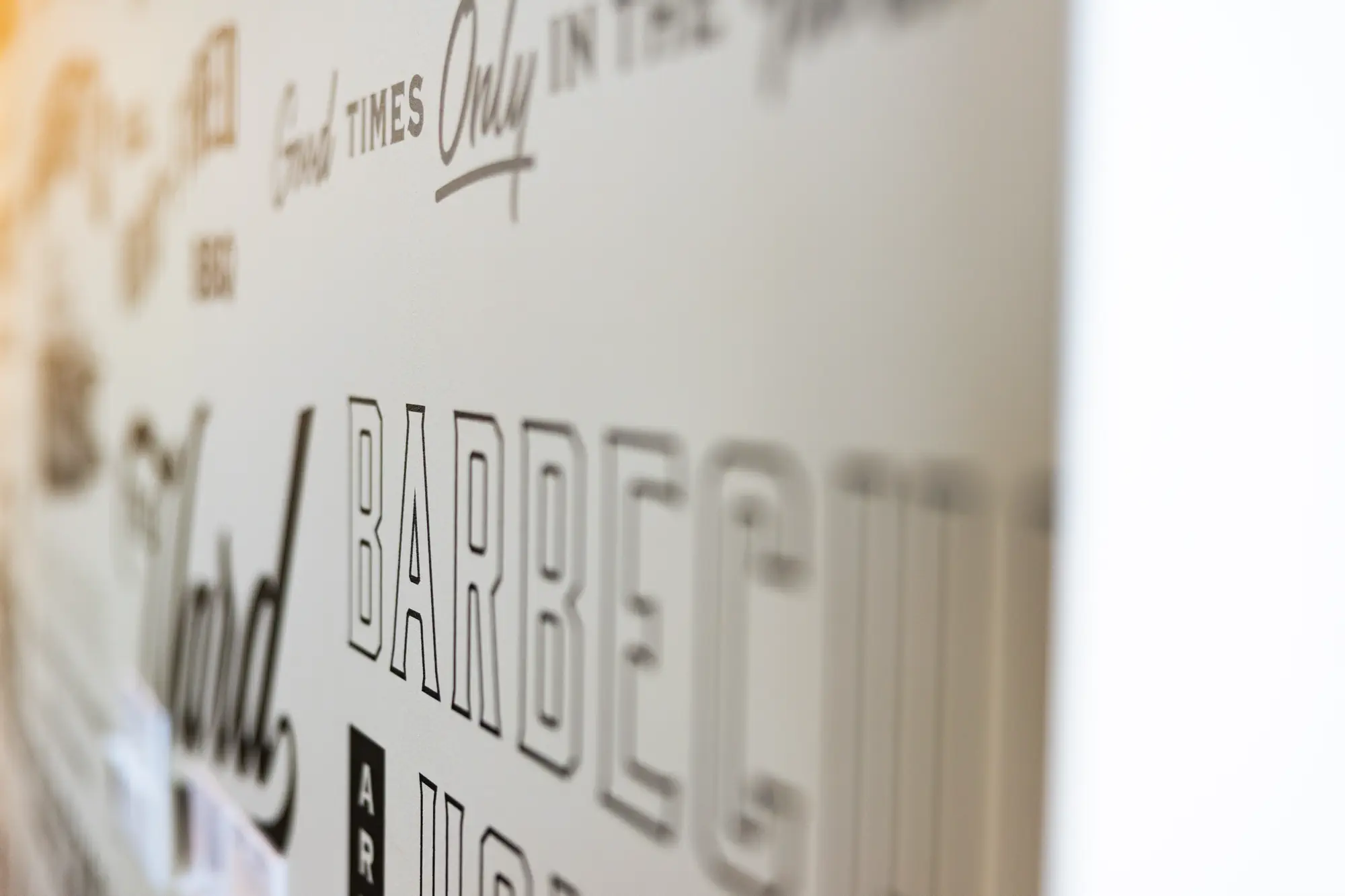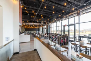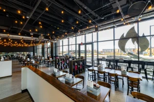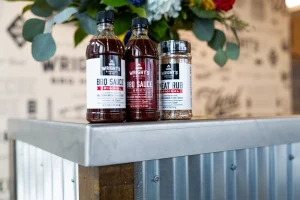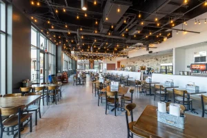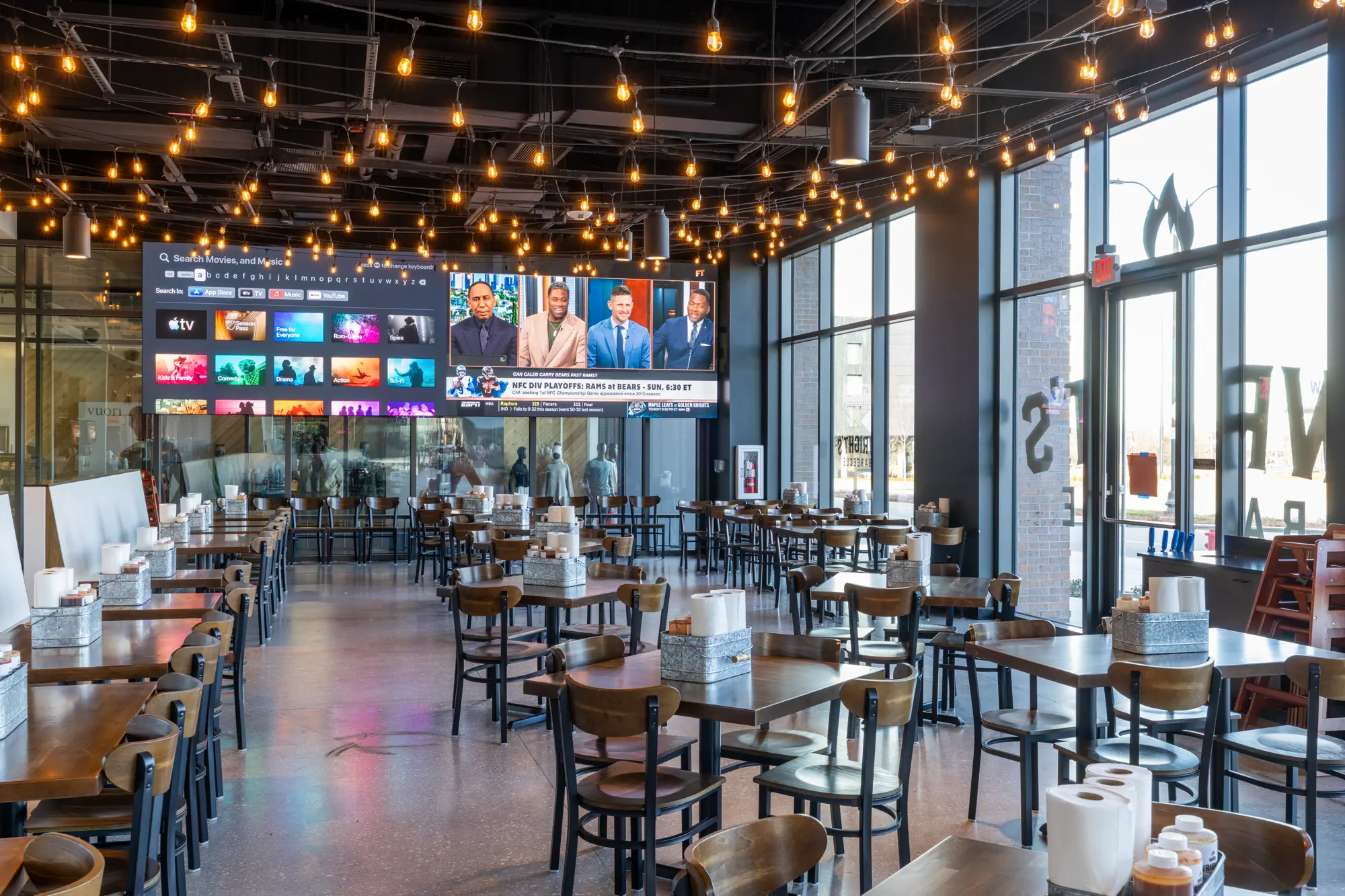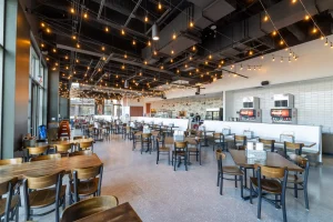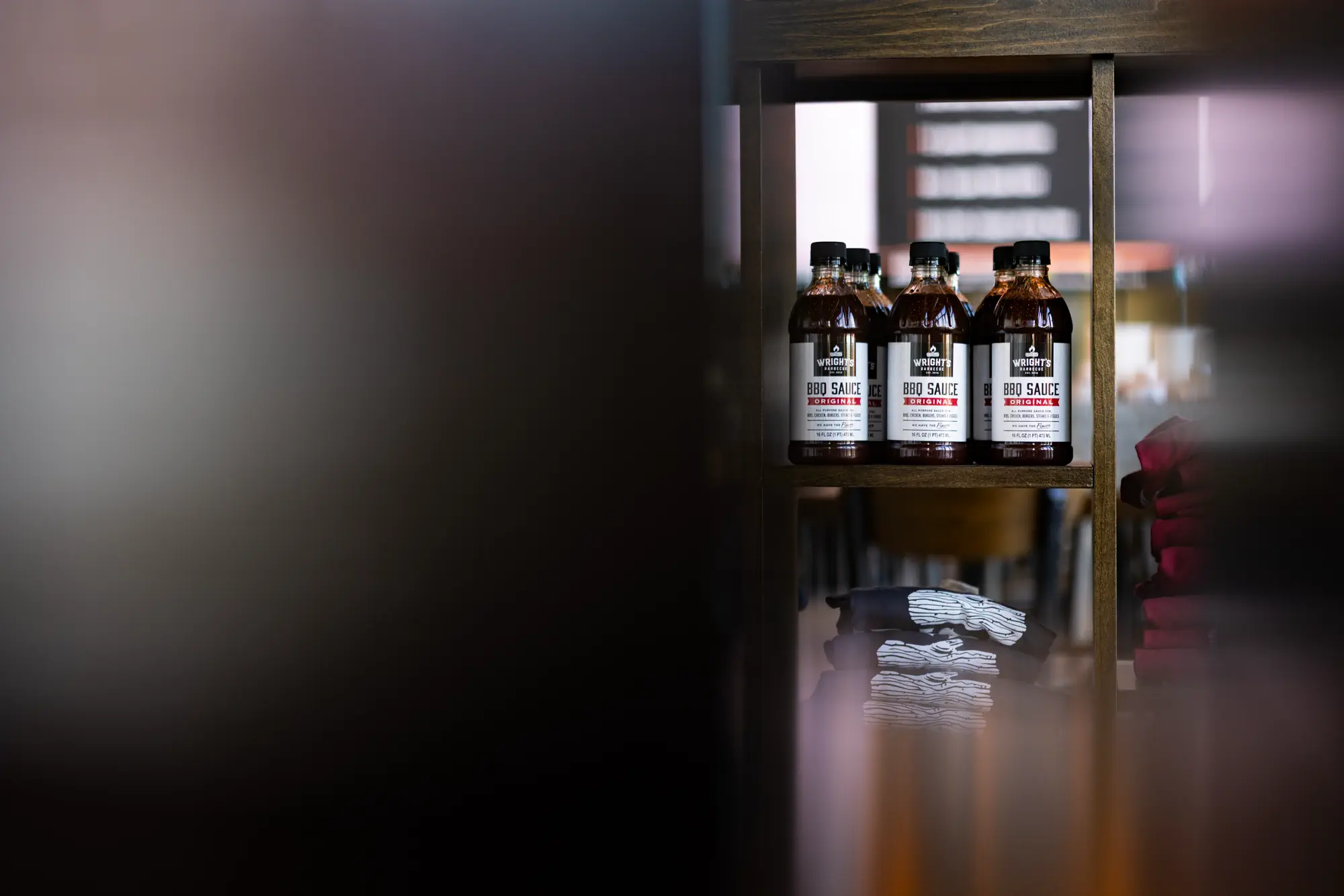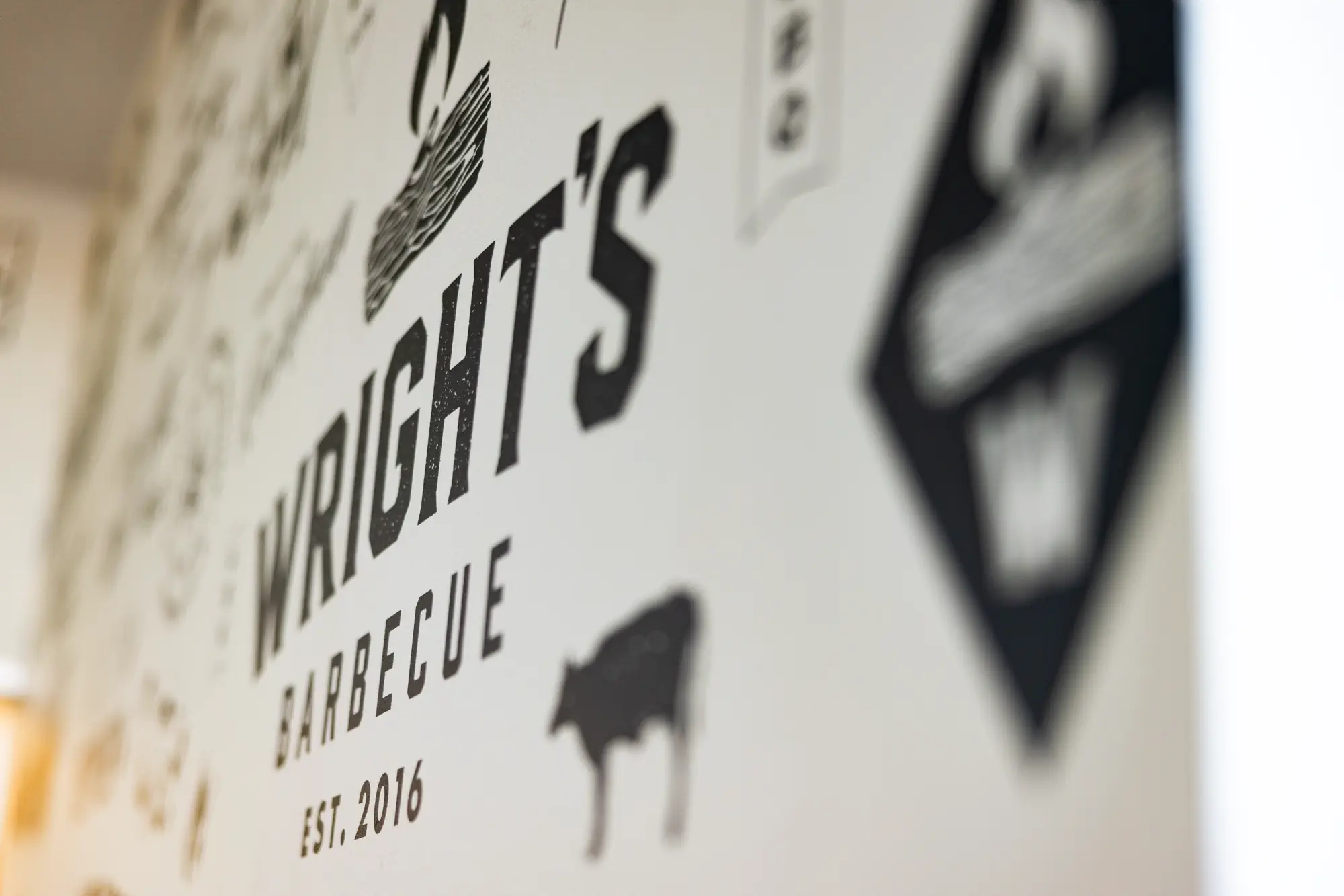 A recently completed restaurant for Wright’s BBQ is located on the Walmart Home Office Campus in the heart of Bentonville, Arkansas. Located just minutes away from the town square, the Wright’s BBQ location on campus is the perfect local spot to enjoy some barbecue and feel immersed in the Wright’s experience in a new way and atmosphere. Beautiful design features include a variety of seating options holding up to 138 customers, string lights, large video screens to watch games, custom designed merchandise shelving, and a materials palette that is cohesive with the Wright’s branding.